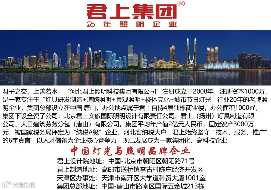 “河北君上照明科技集团有限公司”2008年于中国·唐山成立,注册资金1000万,深耕照明行业20年,是一家集:户外灯具研发制造+照明专项规划设计+城市夜景照明施工+楼宇亮化施工+夜游打卡地灯光投资运维的一站式服务商。