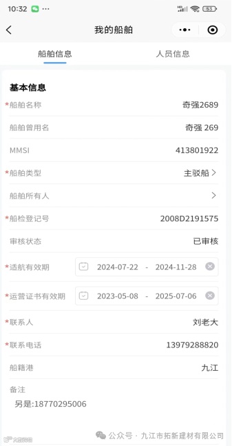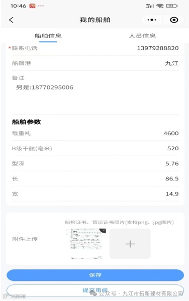 带*号的属于必填项(否则无法提交审核),即:1.船舶名称2.船舶类型3.船检登记号4.适航有效期5. 营运证书有效期6.联系人7.联系电话。其他信息尽量完善;