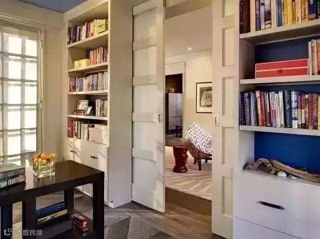 这种设计方法较为常见,它通常是以我们家中的衣柜、书架等作为掩体,在我们将柜体打开后,里面又是另一个使用空间。就拿书架为例,它看起来是一个书架,一般我们不会去转动,但主人知道轻轻转动一下书架就能轻松进入到另外一个房间。这种隐形门较为隐蔽,不容易被发现,除了衣柜、书柜,还有人将镜子等设备作为隐形门的掩体使用。