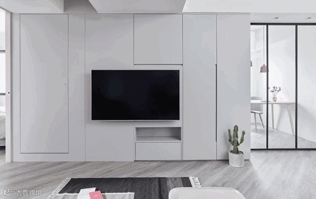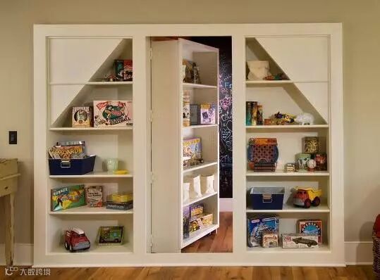 还有一种特殊的设计方式,就是它的形状是不规则的,或是不在一个平面上,从而在视觉上形成了一个对比的掩体。例如隐形门和家里的柱子、凹面上形成一种视觉隐藏,看起来像是一个柱子,人们不去在意,实际上柱子后是另一个空间,这样不仅可以拓展更多的使用空间,还能达到隐藏的效果。