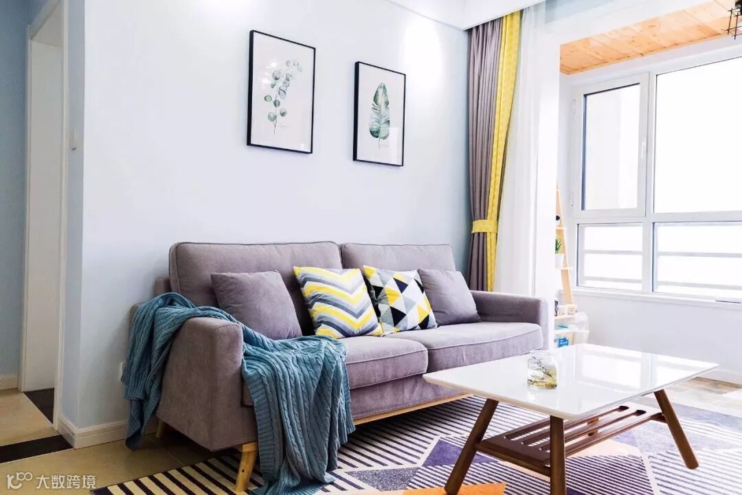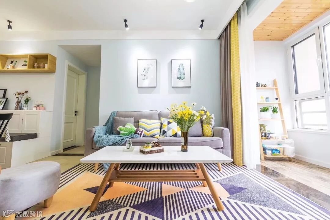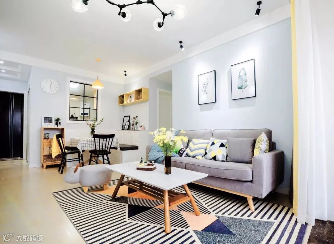 ▲ 清新的墙面漆,搭配灰色沙发,一张几何图案大地毯规划出功能空间