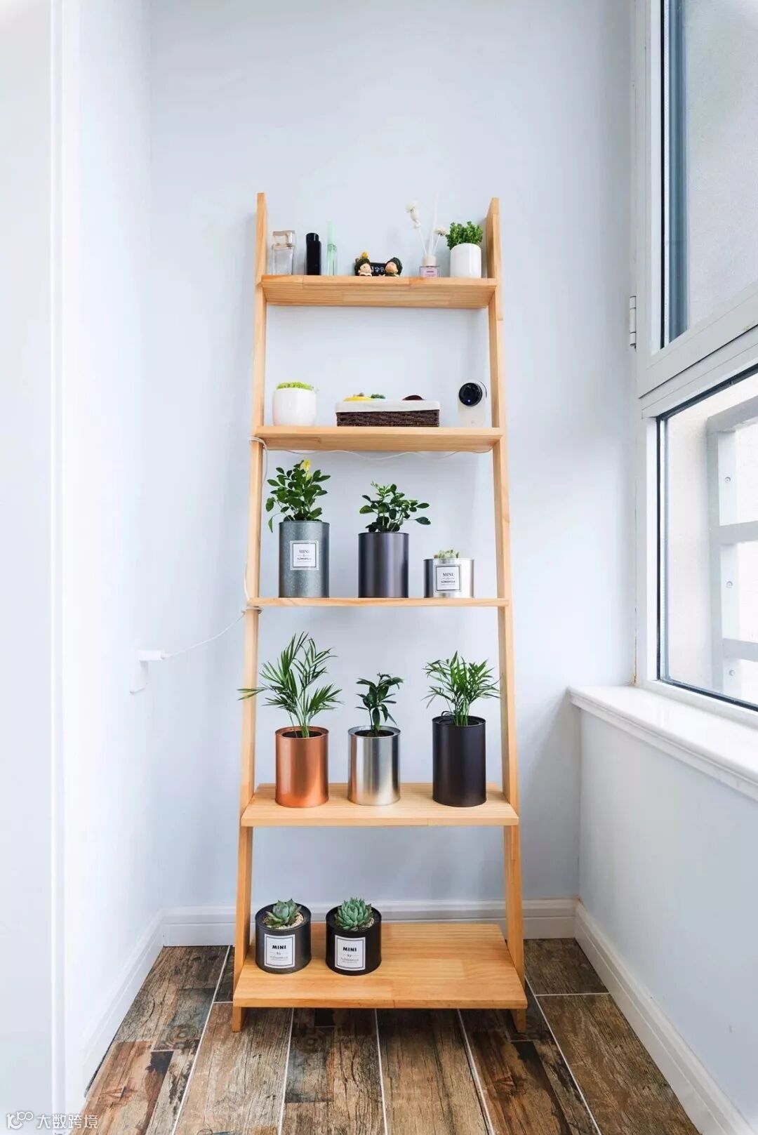 ▲ 休闲阳台,木纹砖与木色层板架呼应,打造自然一角