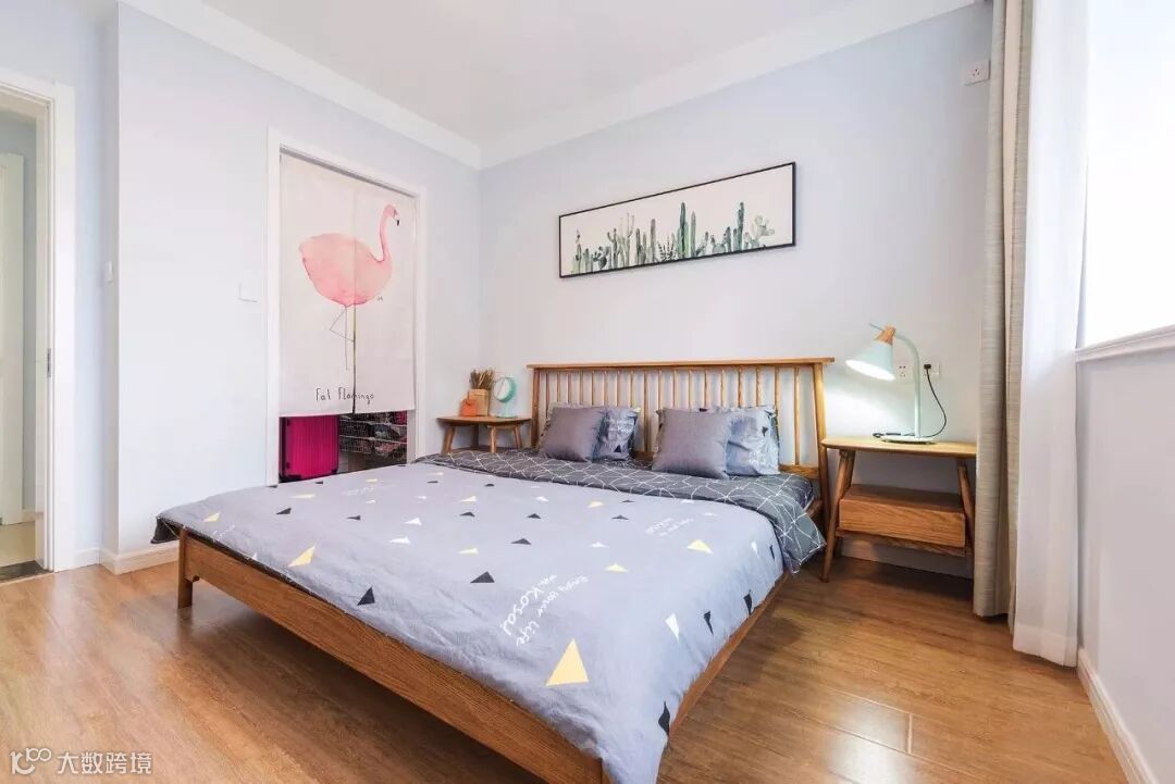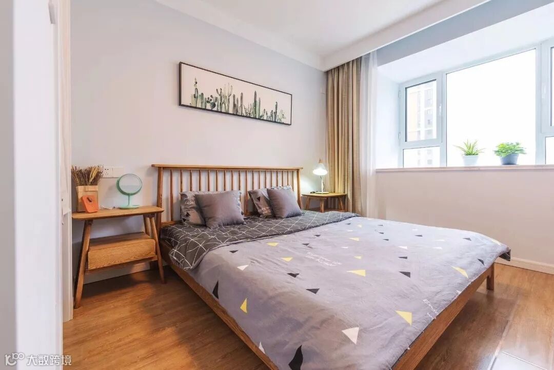 ▲ 主卧木色地面搭配木色家具,点缀绿植图案装饰画作床背景