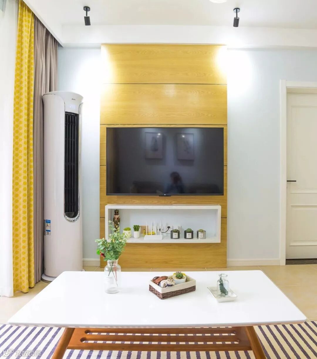 ▲ 冷调乳胶漆搭配层次感木皮作电视背景墙面