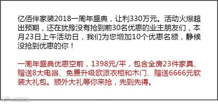 活动至今已有57位业主选择亿佰伴家装。在活动现场每个周五周六晚上都是宾客满满,大家都为争抢前30名优惠而来。还有多位业主在活动现场抢下优惠名额后与设计师之间围绕家装展开的深入对谈,答疑解惑,共筑好家方案。