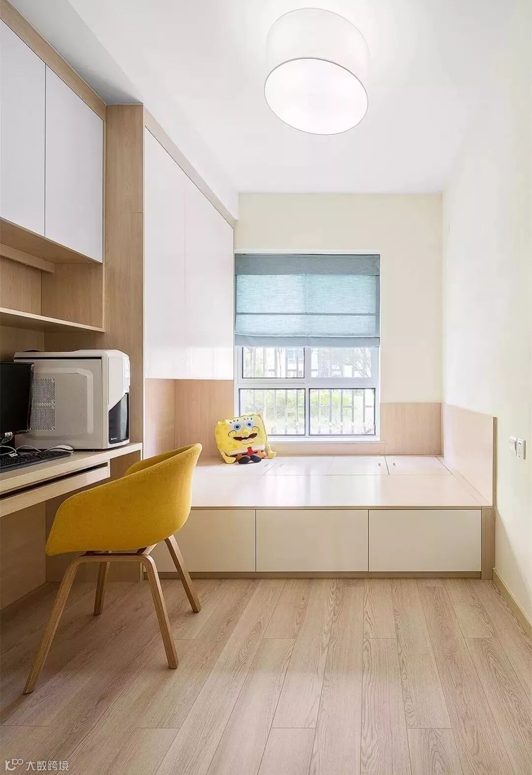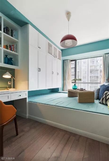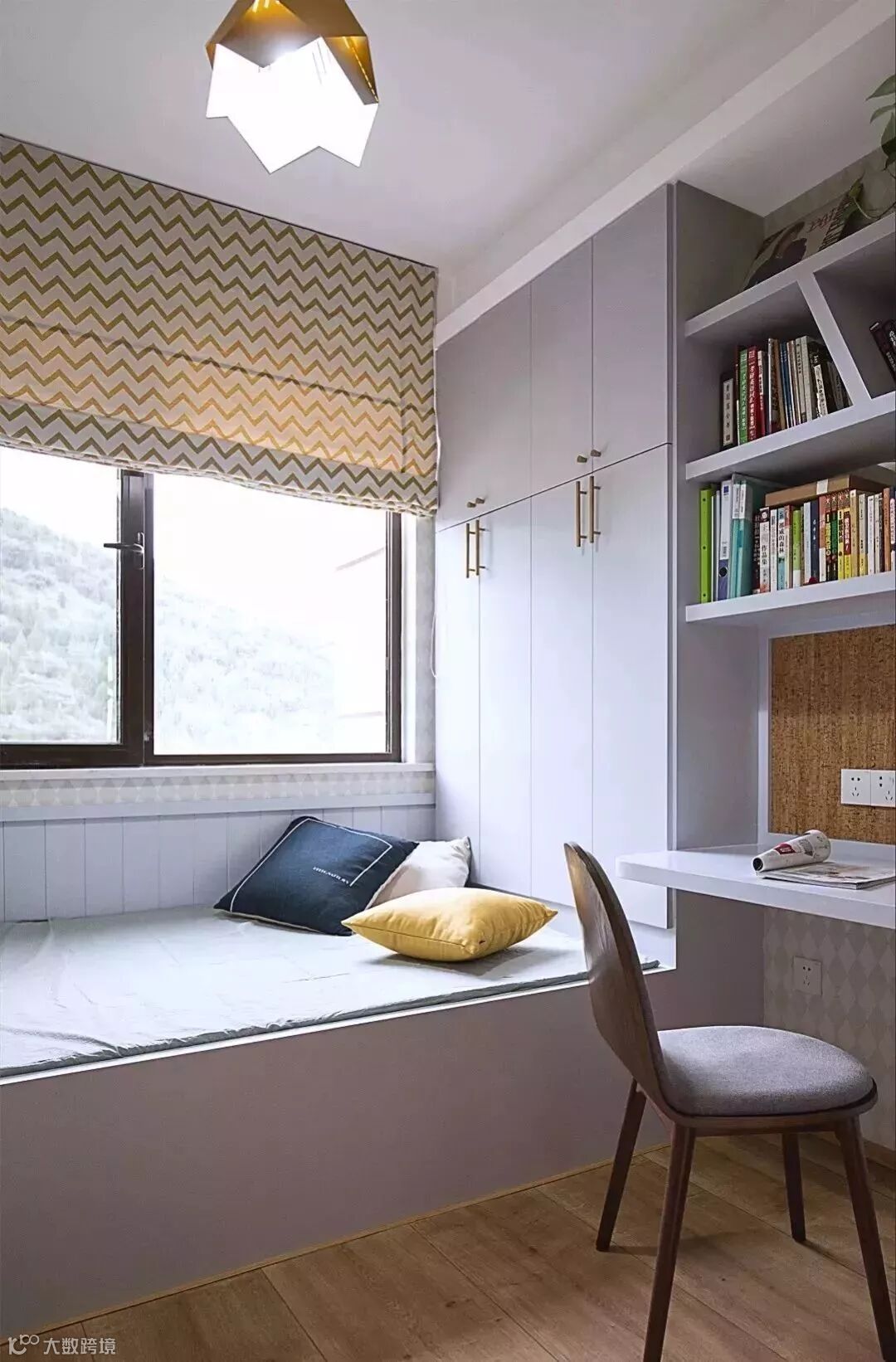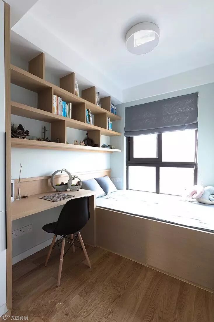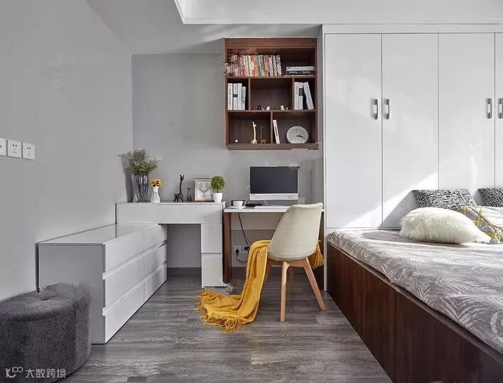 为了丰富榻榻米房的书桌,也可以取消大面积的书柜与衣柜,直接把书桌延伸到床尾,床尾的地方也可以当成座位,电脑可以充当电视,躺在床上看剧,非常不错。