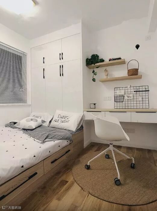 如果你希望装榻榻米的这间房既可以当卧房又可以当书房,可以选择在榻榻米床头或者床尾安装衣柜、书架和书桌,这样不仅可以收纳衣物,也可以收纳书架用来办公,一举多得。