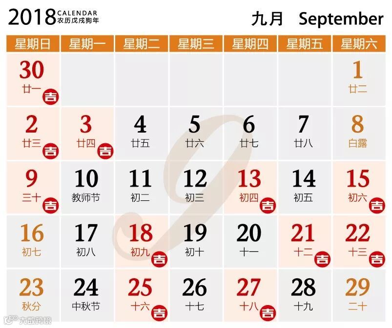公元2018年09月30日 农历08月(小)21日 星期日 天秤座 农历戊戌木年 八月小 廿一日