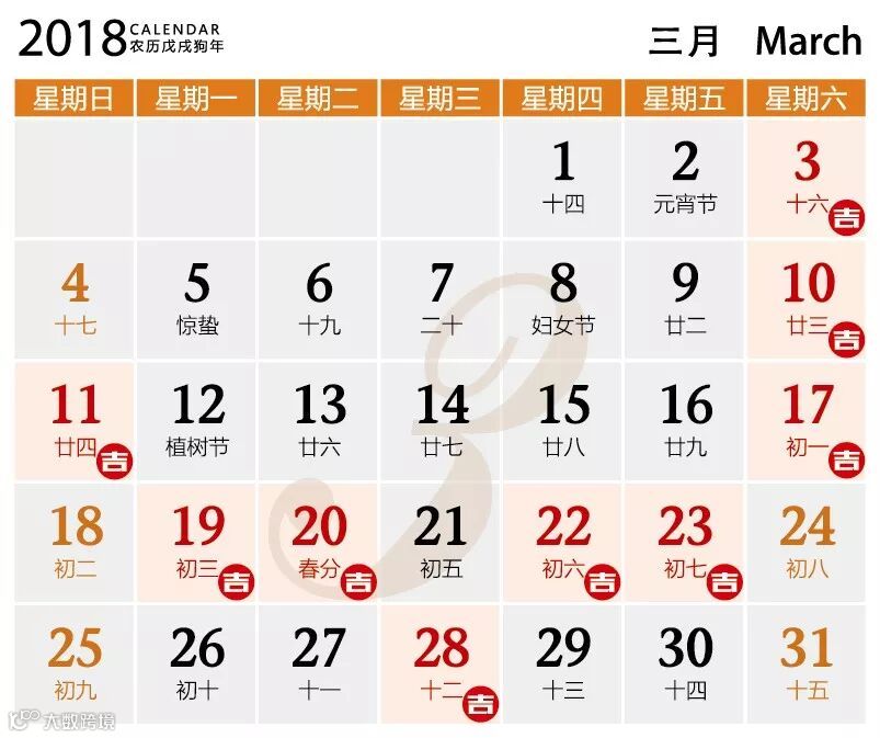 公元2018年03月11日 农历01月(小)24日 星期日 双鱼座 农历戊戌木年 正月小 廿四日