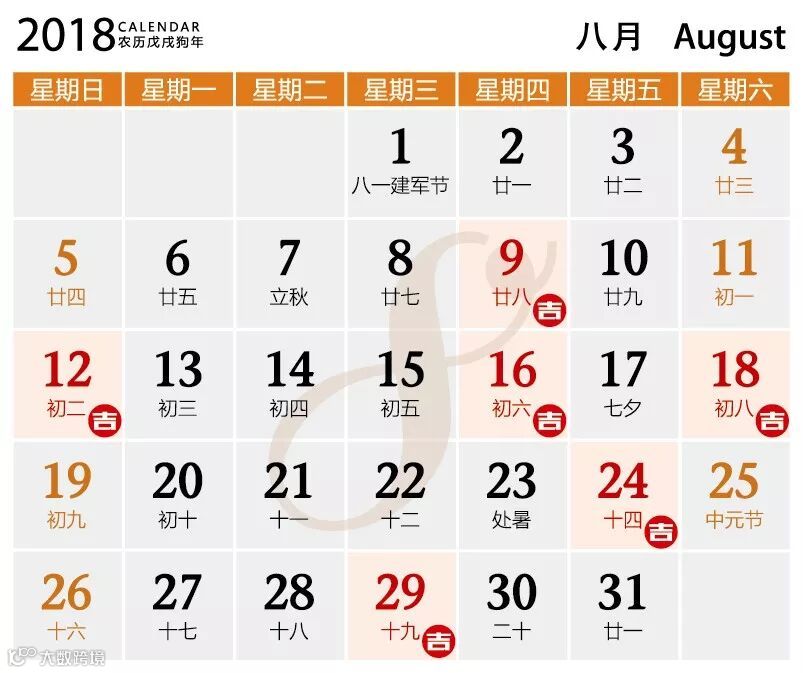 公元2018年08月12日 农历07月(大)02日 星期日 狮子座 农历戊戌木年 七月大 初二日