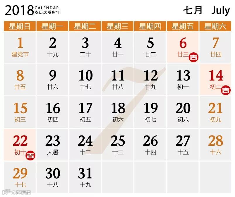 公元2018年07月14日 农历06月(小)02日 星期六 巨蟹座 农历戊戌木年 六月小 初二日