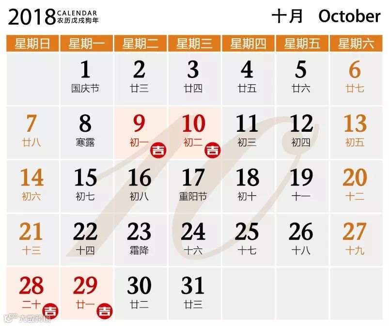 公元2018年10月09日 农历09月(大)01日 星期二 天秤座 农历戊戌木年 九月大 初一日