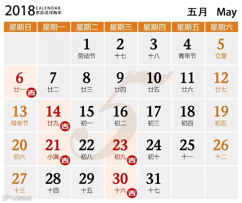 公元2018年05月14日 农历03月(小)29日 星期一 牡牛座 农历戊戌木年 三月小 廿九日