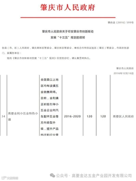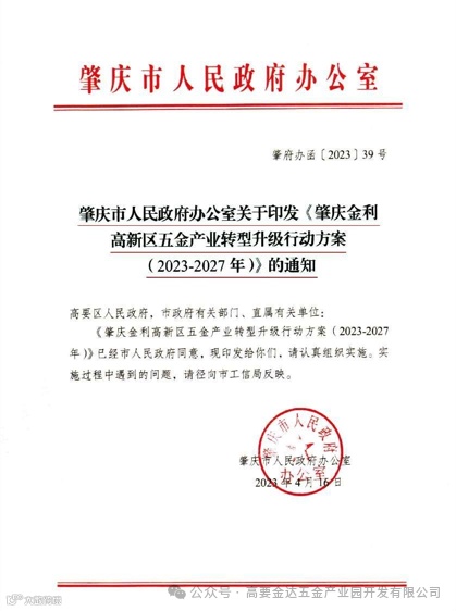 肇庆市人民政府关于《金利高新区五金产业转型升级行动方案 》文件