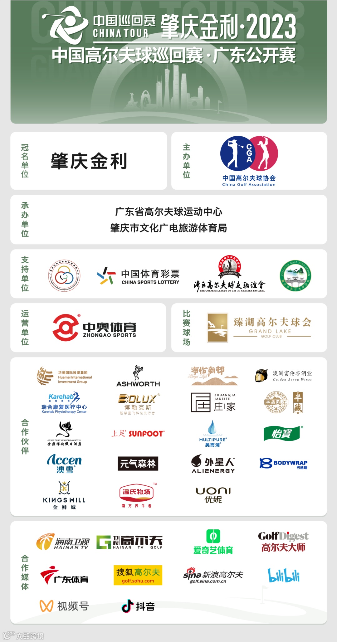 总奖金为50万元人民币的肇庆金利·2023中国高尔夫球巡回赛·广东公开赛由中国高尔夫球协会主办,广东省高尔夫球运动中心、肇庆市文化广电旅游体育局承办,得到广东省社会体育和训练竞赛中心、广东省体育彩票肇庆管理分中心、湾区高尔夫球友联谊会、肇庆市高尔夫球协会的支持,获中国男子职业巡回赛认证,由广东中奥国际体育推广有限公司独家运营。