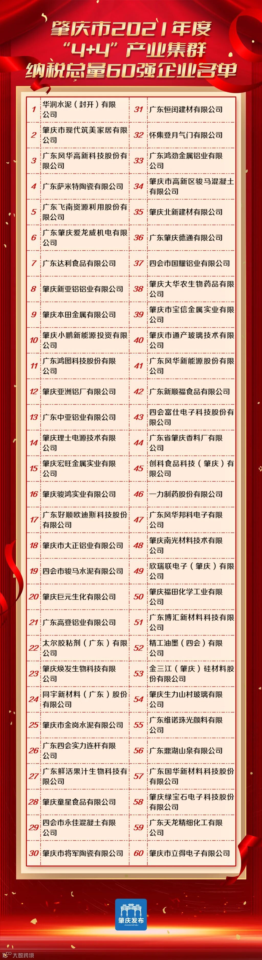 为表扬先进、树立榜样,市政府现决定对华润水泥(封开)有限公司等100家“肇庆市2021年度纳税总量100强企业”、肇庆市现代筑美家居有限公司等100家“肇庆市2021年度纳税增量100强企业”和广东风华高新科技股份有限公司等60家“肇庆市2021年度‘4+4’产业集群纳税总量60强企业”予以通报表扬(具体名单附后)。