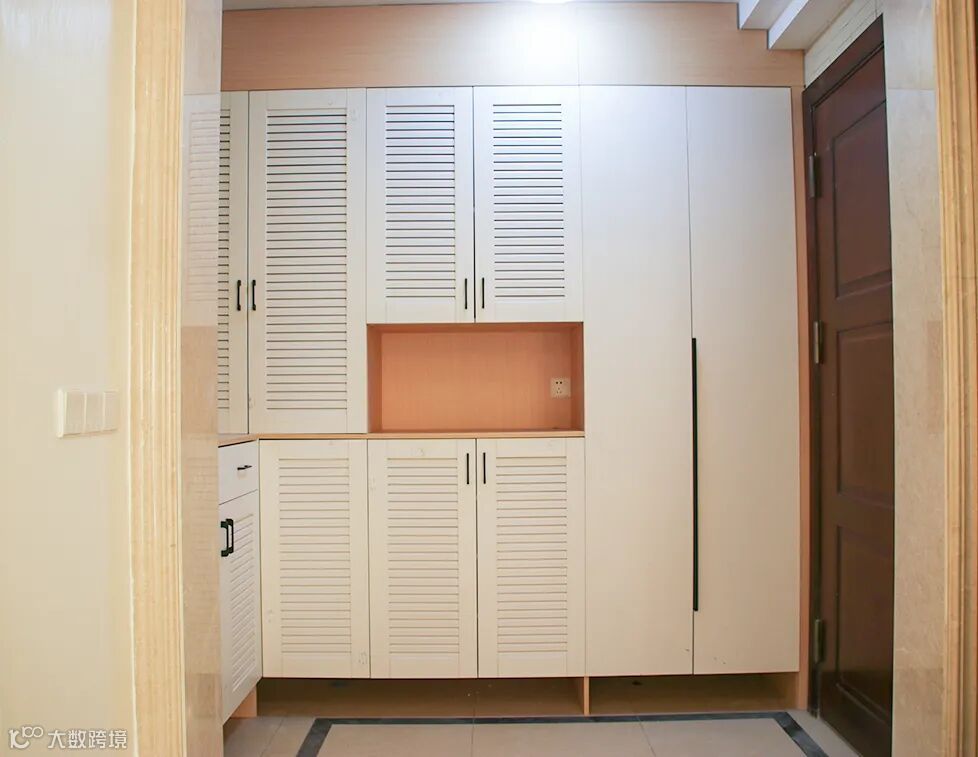对于一进门就直对客厅或餐厅的户型,就可以在大门与客餐厅中间装个隔断+鞋柜组合的设计,增加空间的私密性,同时又增加了空间的收纳功能。