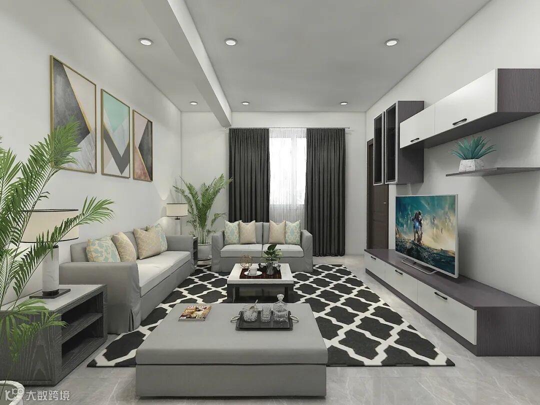 客厅主要以白色和浅灰色拼接而成,搭配浅色地毯,视觉上的撞色体现了整个空间的层次感。