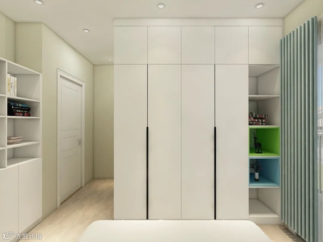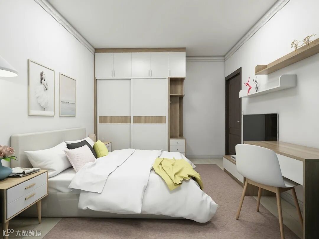 卧室简约、精致,不多余复杂,大面积的木饰面给人以舒适的惬意感,让人卸下一天的疲惫,体验温和、随意。