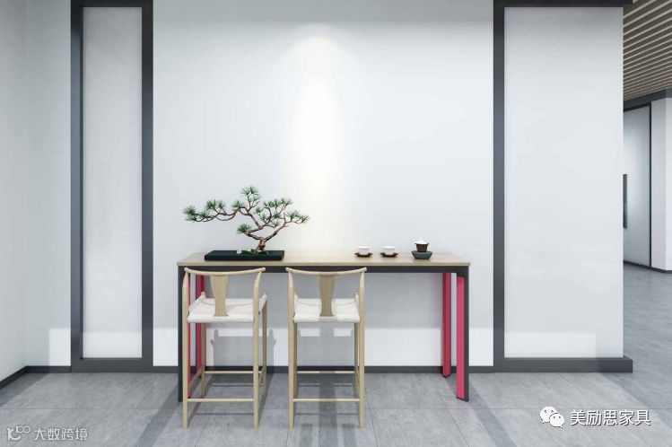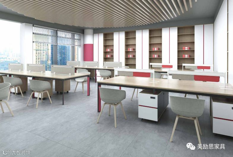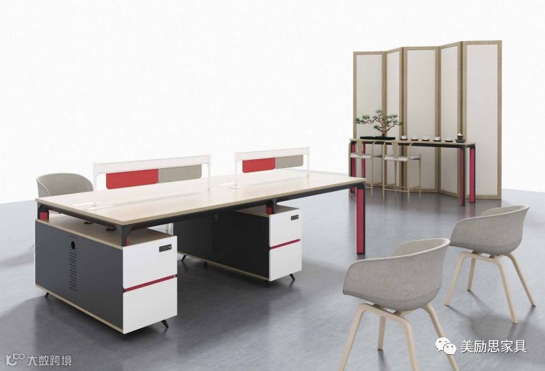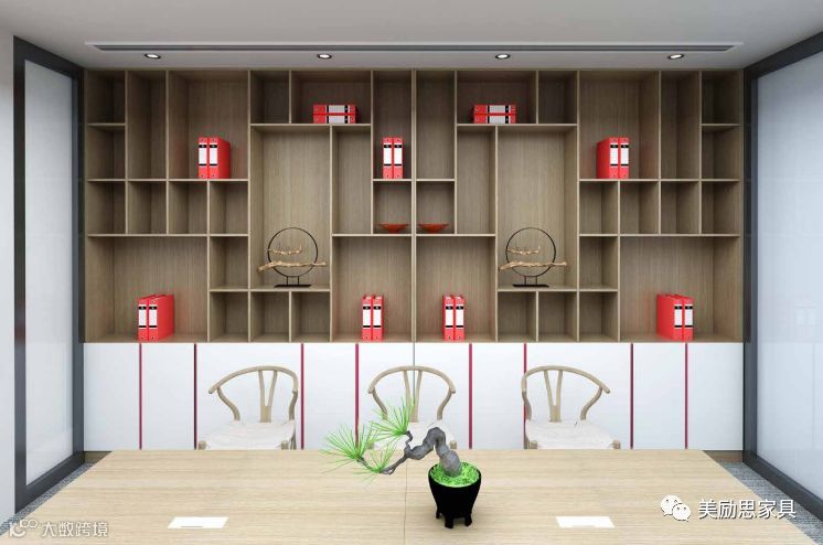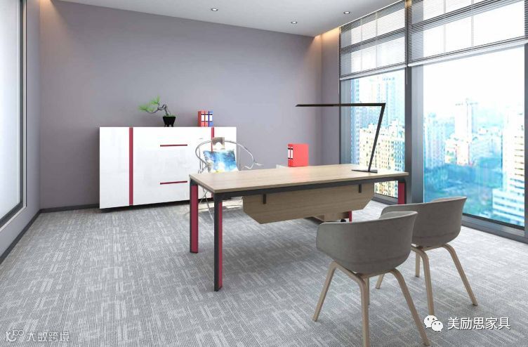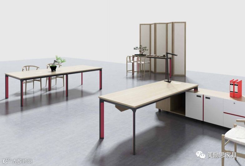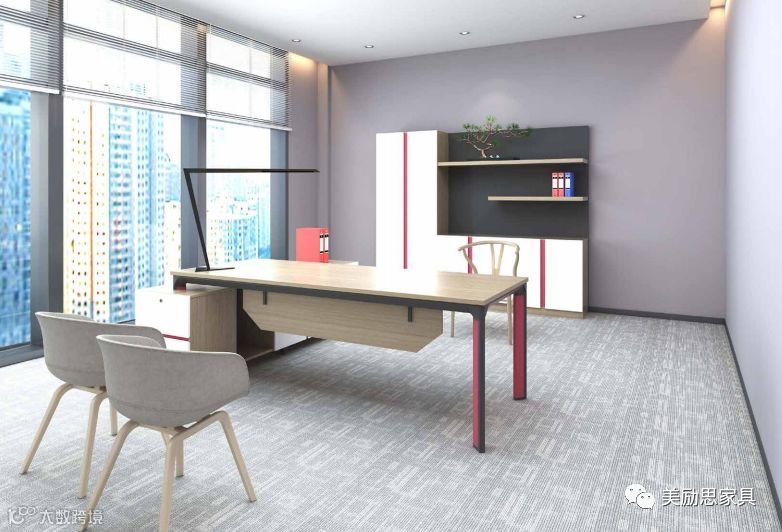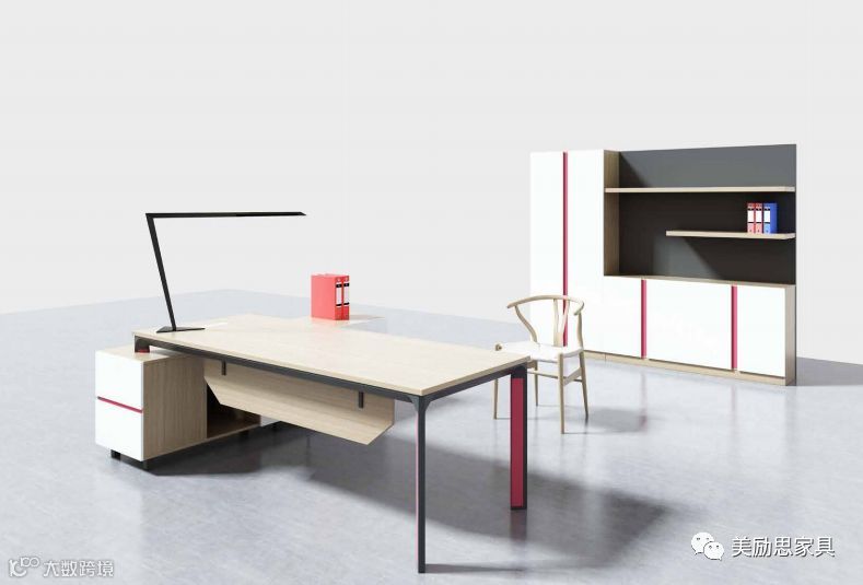 经理办公室的增加文件柜和班台副柜,采用红色和黑色边框设计,优美的线条与分层,使之从一款实用型的办公桌变身为空间的一个精美装饰。