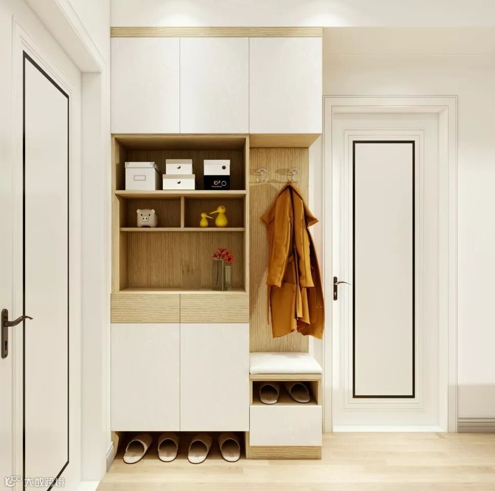 门厅衣柜的设计应根据空间大小,风格及个人喜好设计结合自己户型空间,比如门厅空间比较狭小,设置矮柜觉得浪费了空间那就可以沿墙设置几排到顶的层板或壁挂式的柜子,这样悬挂衣服、帽子或其他物品都可以。