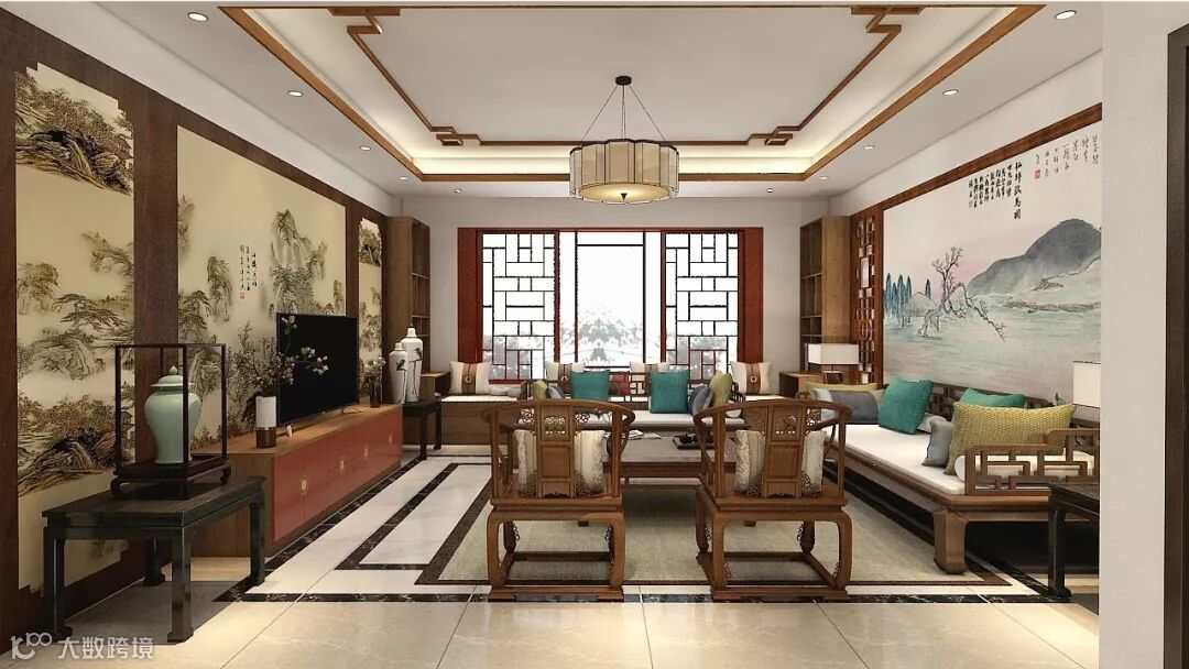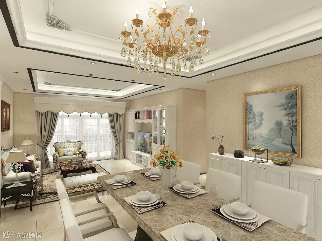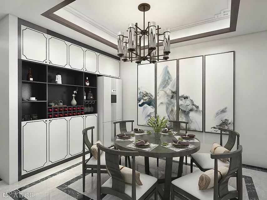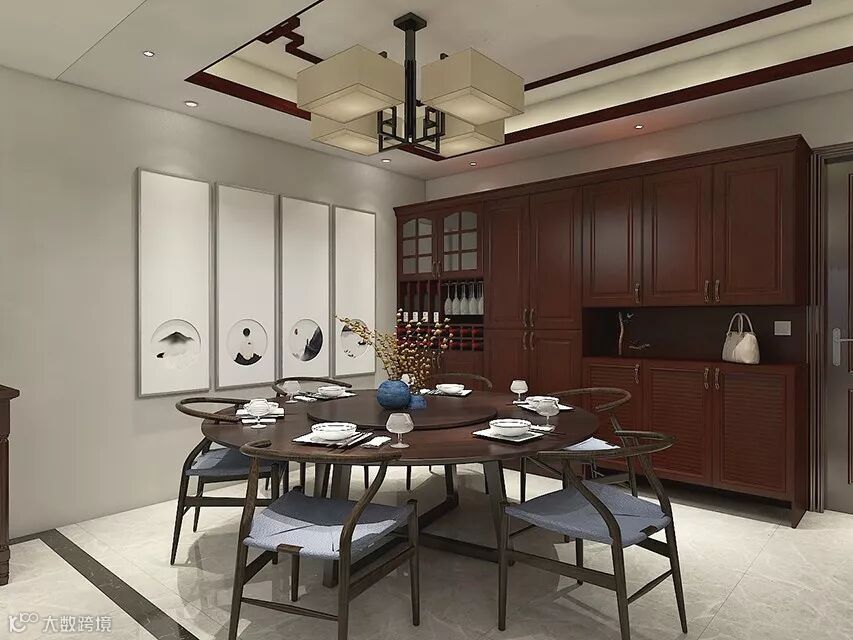 餐厅空间,木艺椅子搭配圆形餐桌和顶部创意的吊灯,整个餐厅显得格外的精致。