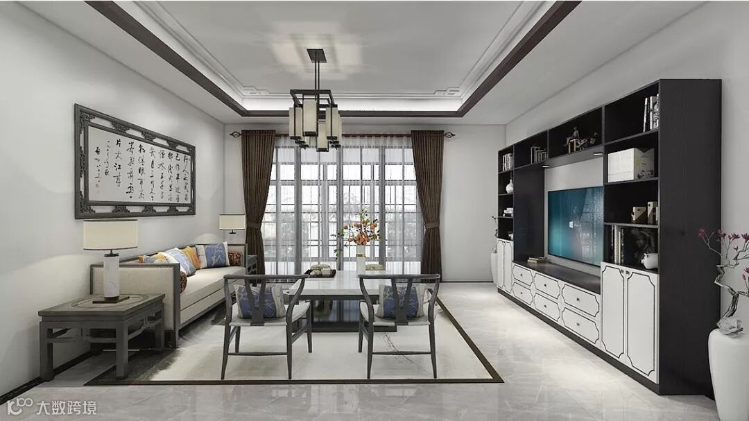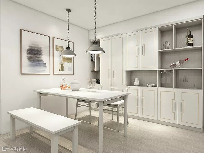 餐厅的侧方还摆放了收纳柜辅助收纳,餐厅和客厅之间摆放一个绿植作为隔断,白色的沙发背景墙上挂着几幅简洁挂画,简单大方。