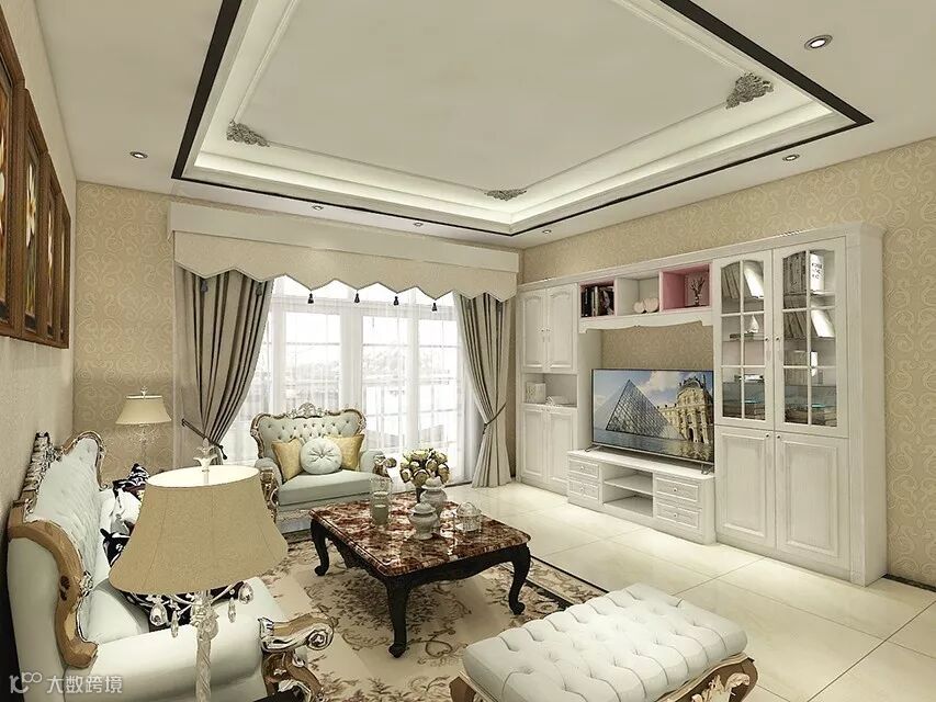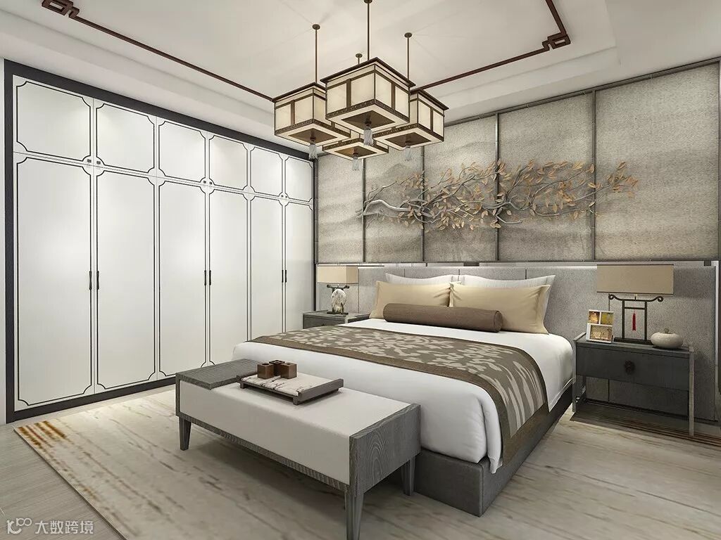 主卧室以白色和灰色为主,白色的墙面和灰色的窗帘、床品结合起来,床头靠背做了几何造型,整个卧室显得轻松而又舒适。
