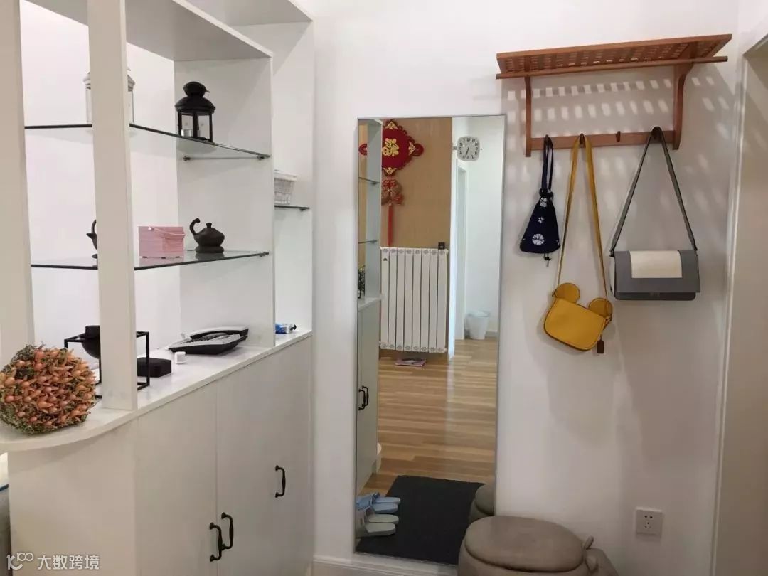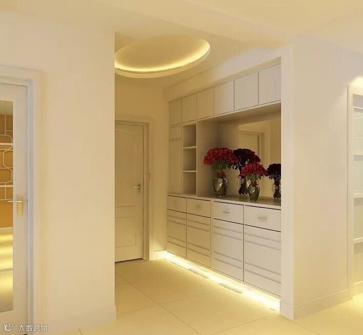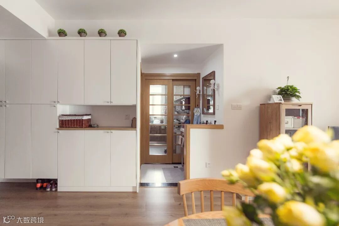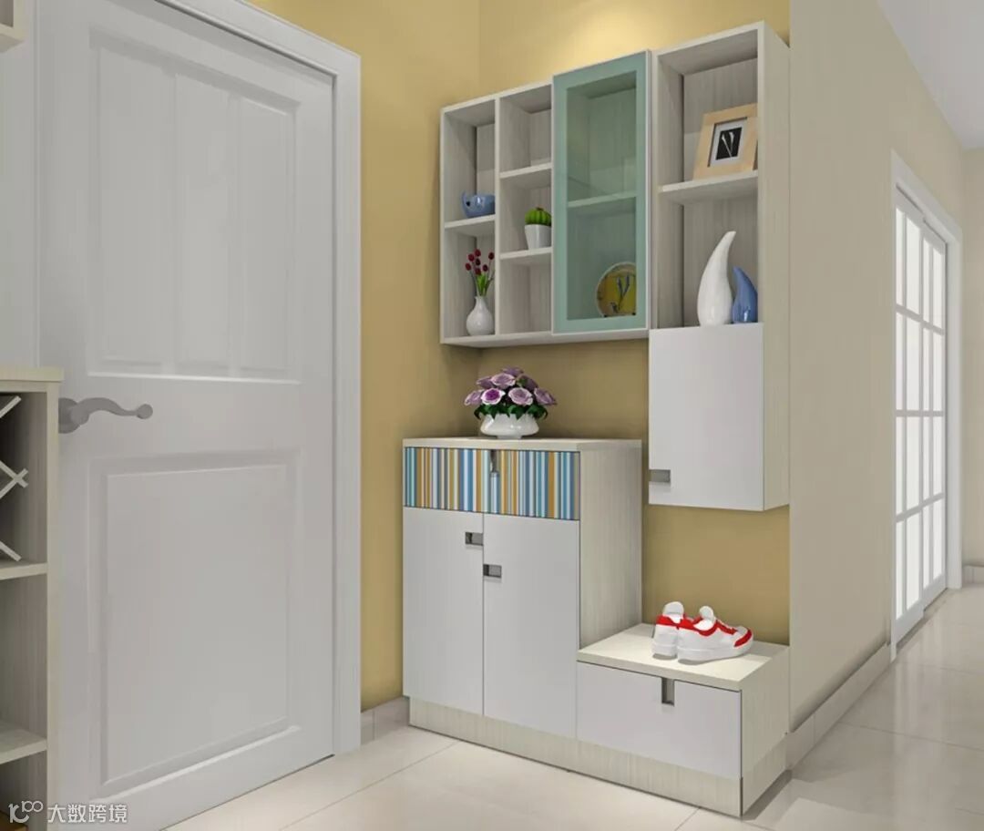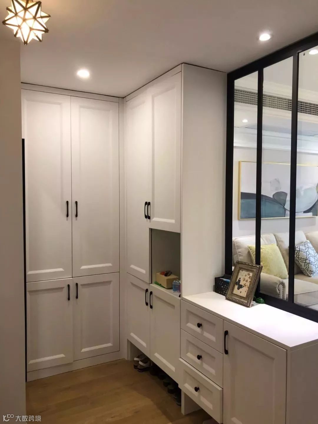 对于一进门就直对客厅或餐厅的户型,就可以在大门与客餐厅中间装个隔断+鞋柜组合的设计,增加空间的私密性,同时又增加了空间的收纳功能。