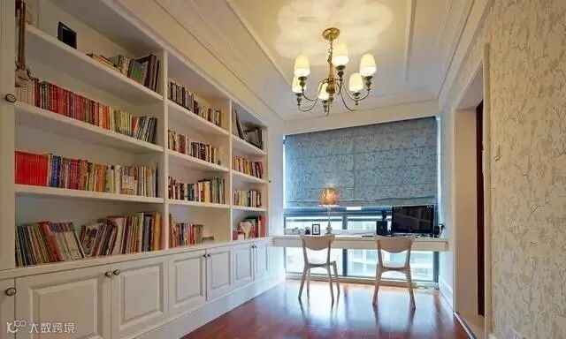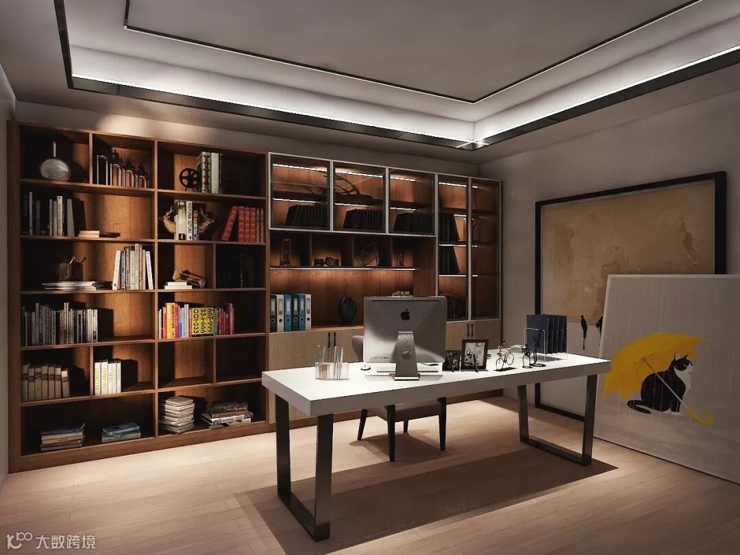桌支脚形U形创意造型,由线组合的交叉面构成;深色的书柜墙面,被柔和的隔板灯光打亮,横向线条更与空间的书香气韵共同突显。