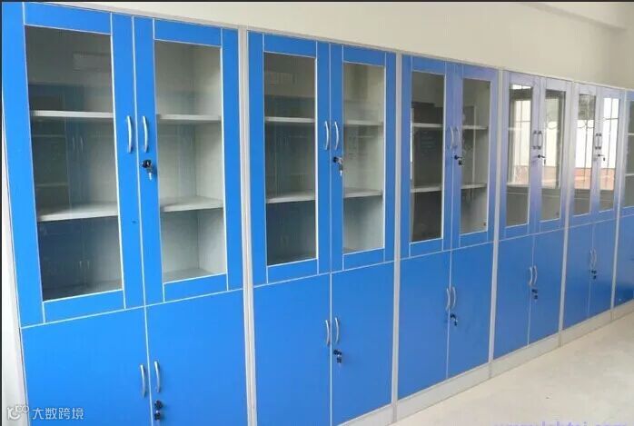4、药品柜:药品柜是化学实验室必不可少的橱柜。主要放置固体化学试剂和标准溶液,这两者必须分类放置,不可混放在一起。
