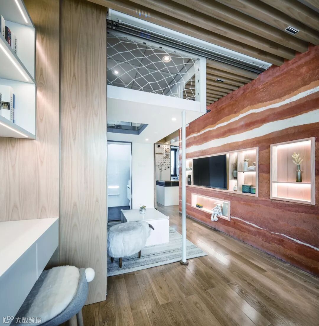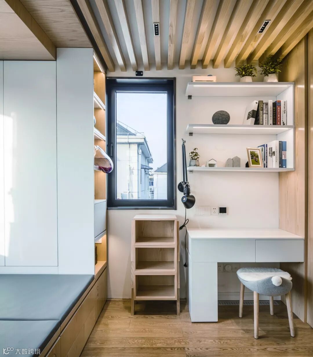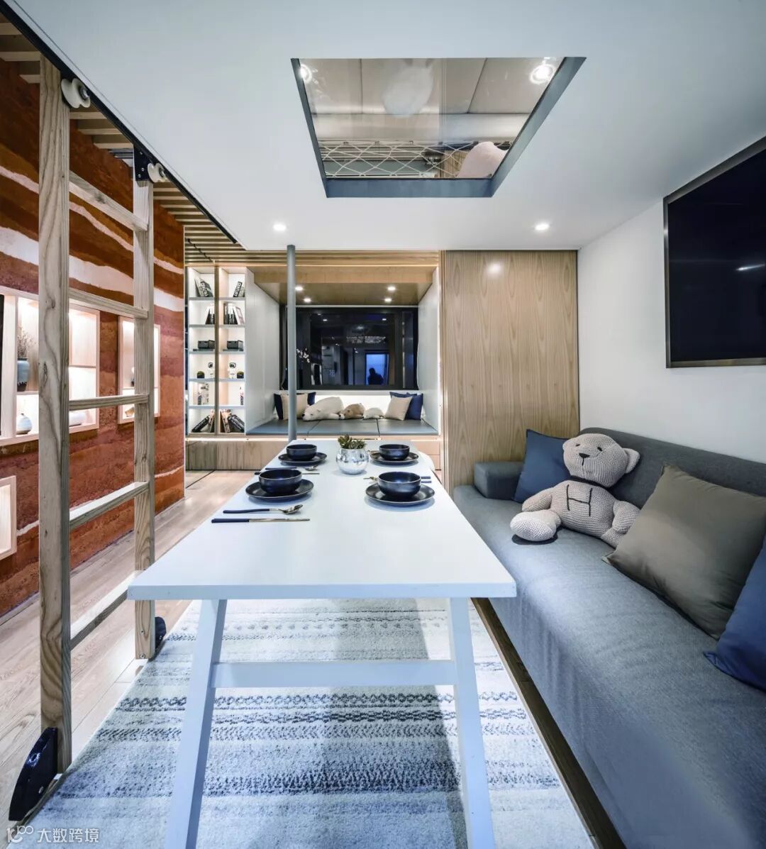 “翠玲珑”的设计概念也给收纳带来了优势,在与业主沟通的过程中,设计师发现他们不能接受“变形金刚”式的家具,业主认为很多可变家具虽然能呈现有趣和炫酷的节目效果,但对于实际使用者并不友好。很多节目中的住宅回访之后又回到了原初的状态,此时与其说是责怪使用者辜负了原本设计的匠心,不如说在最初制定策略时没有为使用者的习惯量身订制。设计师认为在家居设计中更应当强调人对空间的“无意识”使用,同时因为起居文化的差异性,大多数中国人可能都无法适应日式家居的极致折叠和收缩,因而设计师尝试采用空间变形而不是家具变形的手法,来打造适合这一家人的日常起居空间。设计的出发点是解决问题,当设计真正服务到一个具体的对象时,就需要更多具体的思考,是从小往小里做(设置更多机巧的机关),还是从小往大里做,是设计师原初策略的选择,在本案中,显然后者是更适合这一家人的。