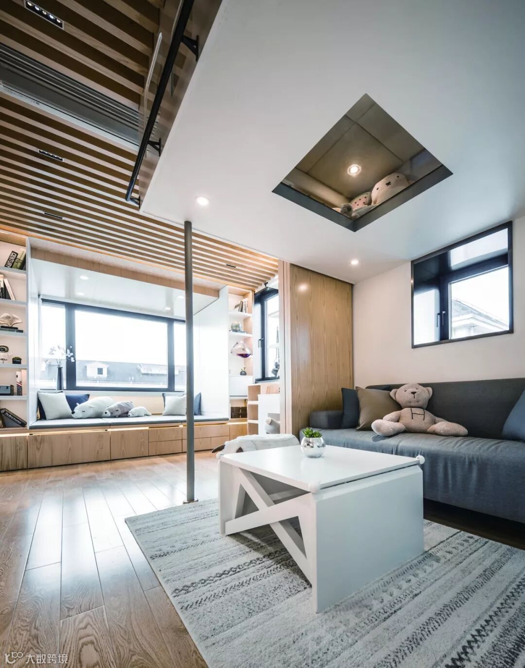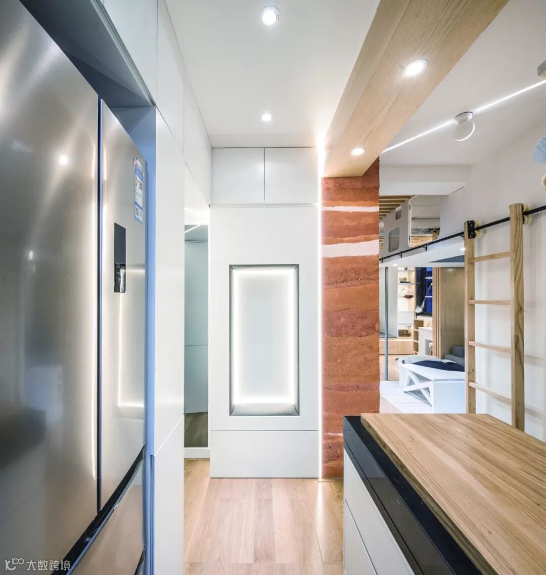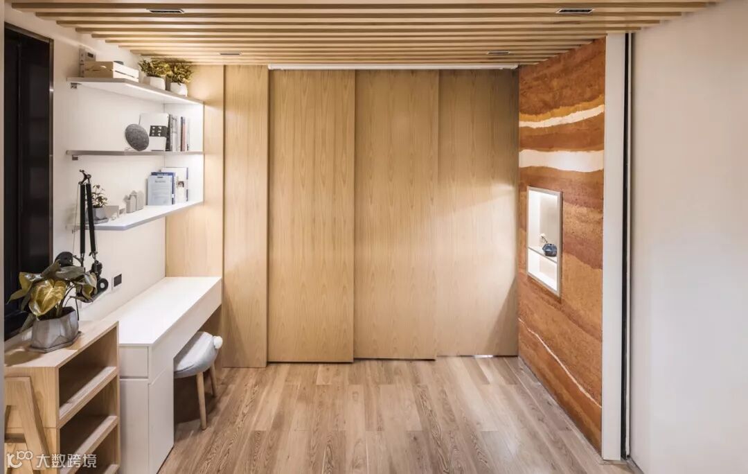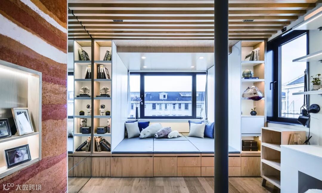 “翠玲珑”的设计概念也给收纳带来了优势,在与业主沟通的过程中,设计师发现他们不能接受“变形金刚”式的家具,业主认为很多可变家具虽然能呈现有趣和炫酷的节目效果,但对于实际使用者并不友好。很多节目中的住宅回访之后又回到了原初的状态,此时与其说是责怪使用者辜负了原本设计的匠心,不如说在最初制定策略时没有为使用者的习惯量身订制。设计师认为在家居设计中更应当强调人对空间的“无意识”使用,同时因为起居文化的差异性,大多数中国人可能都无法适应日式家居的极致折叠和收缩,因而设计师尝试采用空间变形而不是家具变形的手法,来打造适合这一家人的日常起居空间。设计的出发点是解决问题,当设计真正服务到一个具体的对象时,就需要更多具体的思考,是从小往小里做(设置更多机巧的机关),还是从小往大里做,是设计师原初策略的选择,在本案中,显然后者是更适合这一家人的。