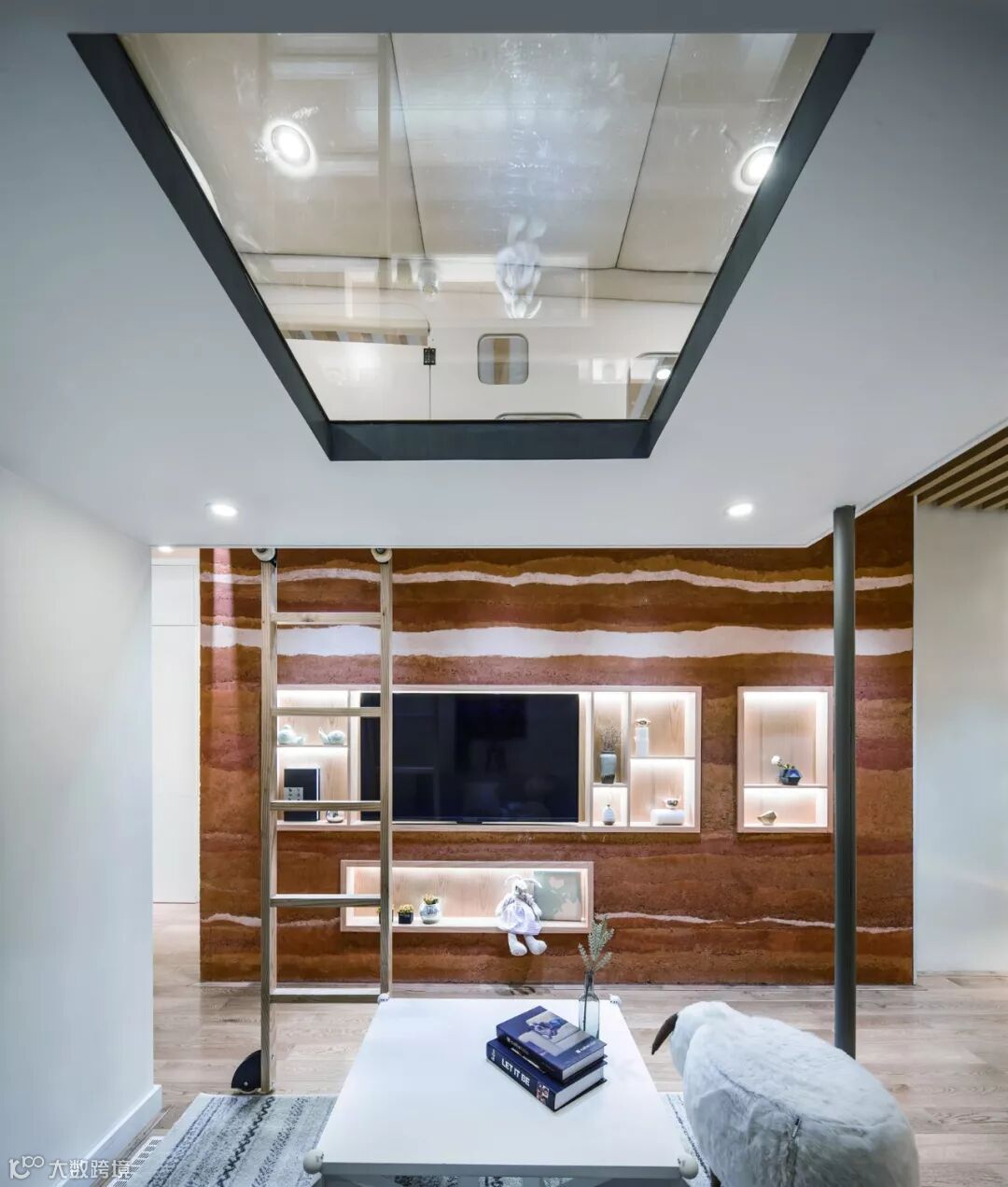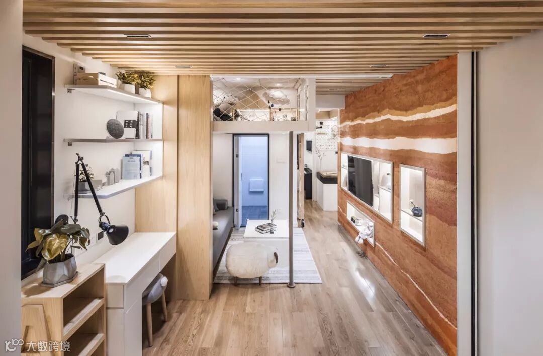 平面是通过方形几何的叠加和分合来组织的,是一种较为抽象的方式。当材料参与进来时,空间又有了作为居所的更为具体的表情。有趣的是,当夯土墙、木格栅、木饰面、球网等材料加入到空间中时,那种方形几何的组织依然能够在立体的空间里呈现出来。房间的净高是2.95m,在客厅的沙发区,设计师加入了一个夹层,作为儿童钻爬玩耍、放置玩具的空间,给沙发区留了1.85m的净高。这个夹层就像一个空腔般的吊顶,对下方有洞口打开的感受,侧面则有球网围护出半透明的效果。夹层角部由一根纤细的钢柱支撑,又创造出一个对外开敞的立方体区域。夯土的电视墙上几个白色收纳洞口内嵌,在侧面挖出几个立方体。主卧更是利用固定家具形成一个与窗连续的虚体,一个完整方形洞口。这一系列实实虚虚的立方体让简洁的空间富有层次。材料基本以整面的方式铺设,夯土墙设于分户隔墙上,避免对邻居的干扰,木格栅的包裹则起到均匀声场的作用,有了这些措施一个可以兼作为歌唱厅的多功能空间就实现了。在这个项目里,材料在让空间更柔软更温馨的同时,也以业主的需求作为出发点,完成了为他们的爱好量身打造的功能作用。