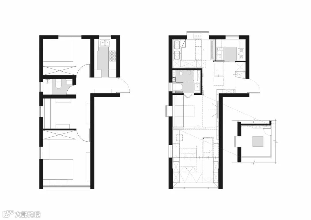 设计师的平面灵感来自古典园林“翠玲珑”的空间概念,从对角线的方向组合方形空间,让这些方形空间部分独立又有所重叠。“翠玲珑”的空间模式主要出现在两处。一处是入口、开放式厨房和老人房三个空间延续出的对角线空间,此处的空间进深因此从1.7m扩大到6.1m;另一处“翠玲珑”空间原型是由内厨房、入口和客厅组成的,此处的视觉深度也从3.5m增加到7.5m。“翠玲珑”既是一个连续的空间,又因为其锯齿状边界可以有更多余地组织壁柜等收纳功能,这种“大”不是大户型敞亮连续的大尺寸空间带来的实际大小,而是借相邻空间的视觉可达性带来的视觉大小。这种空间策略化解了原有的尺寸限制,是一种“小变大”的设计思路。