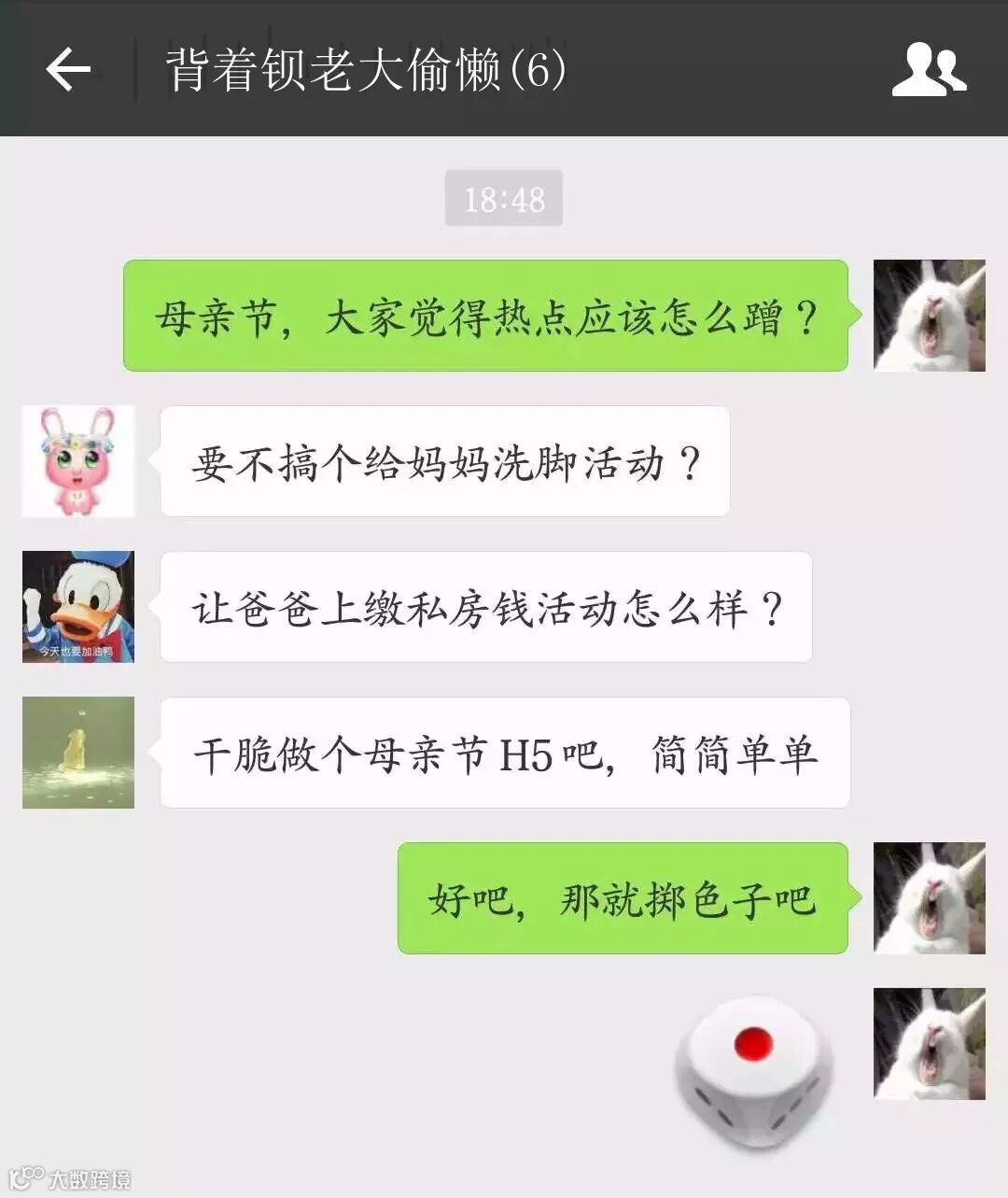 销售和运营人都是一条绳上的蚂蚱,拉着团队的伙伴想在微信活动推广选题,谁的点子好就用谁的,实在没想法?听天由命!