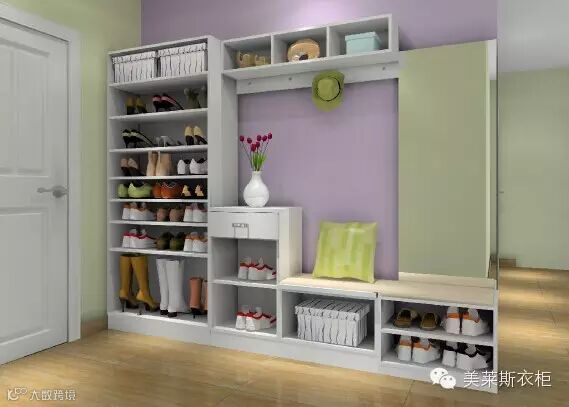 悬挂式鞋柜简约时尚。象牙白柜身配新柚木面板,精致而定制性强的柜体,精美的糖果色系,让整个空间美观实用的同时又打造出一种温馨浪漫的气息。