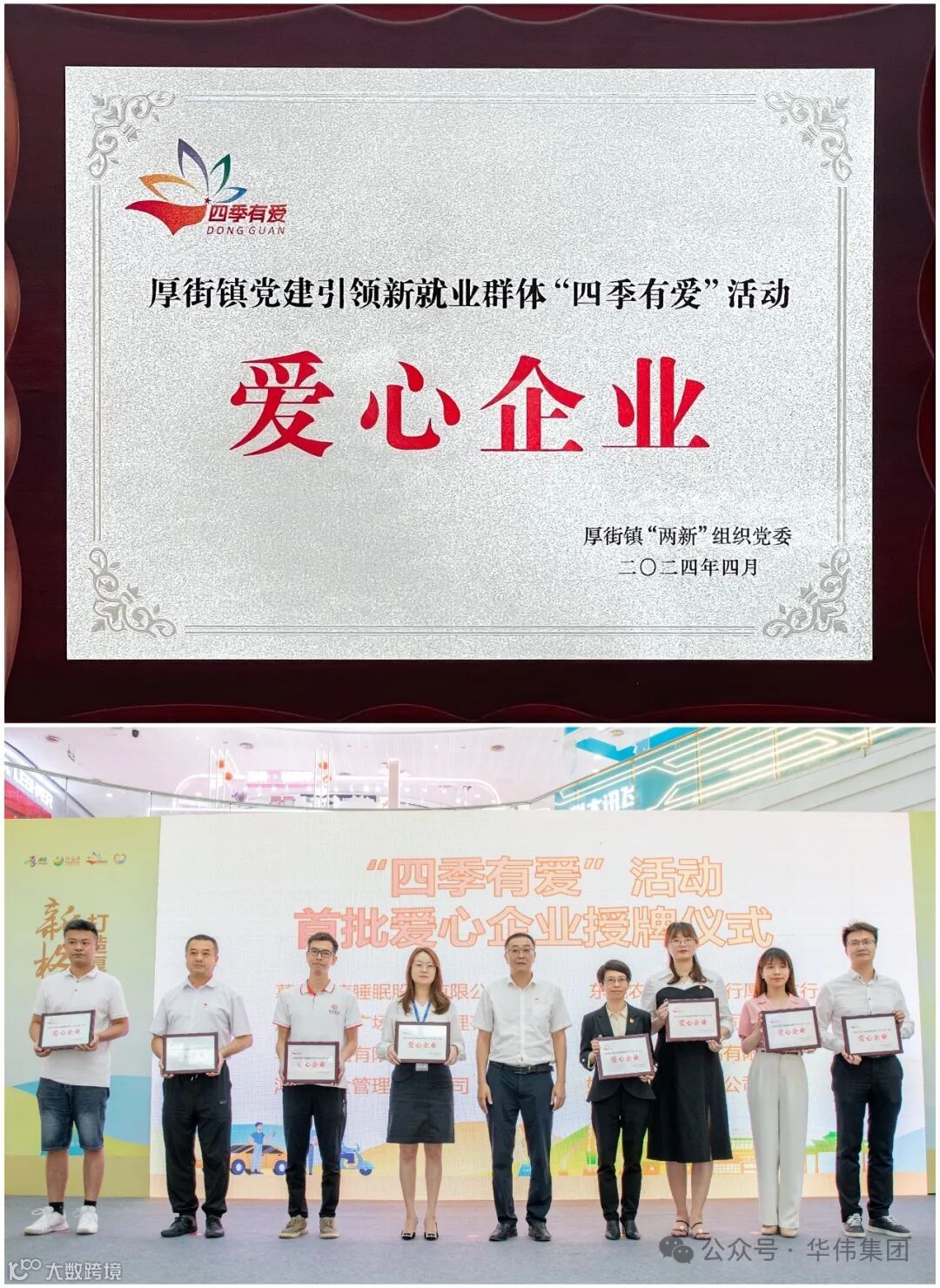 据悉,我司不断加大关怀力度,扩大关爱人群。近日,集团党支部积极响应厚街镇”两新“党建服务中心号召,参与厚街镇党建引领新就业群体“四季有爱”活动,成为该活动的首批爱心企业之一,集团党支部委员劳惠兵参与活动,镇党委委员、镇“两新”组织党委书记张小凯为我司颁发”爱心企业“牌匾。