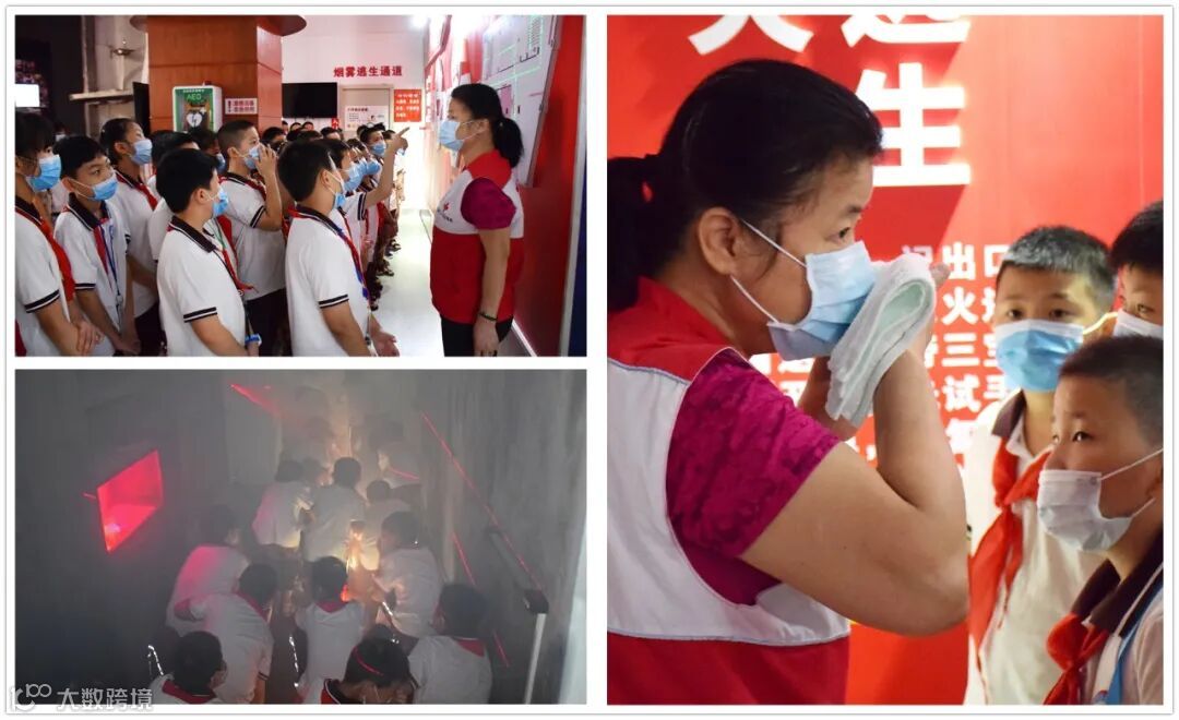 在“火灾逃生”体验区,学生们在讲解老师的带领下,冒着浓烟,带着口罩,缓慢前进。