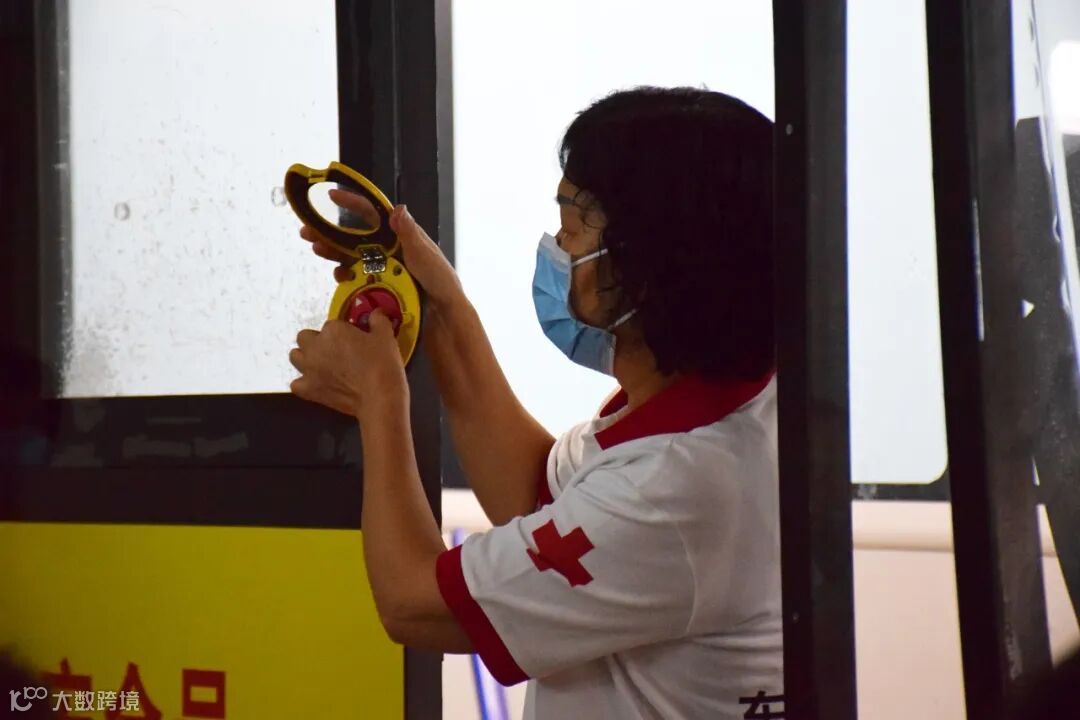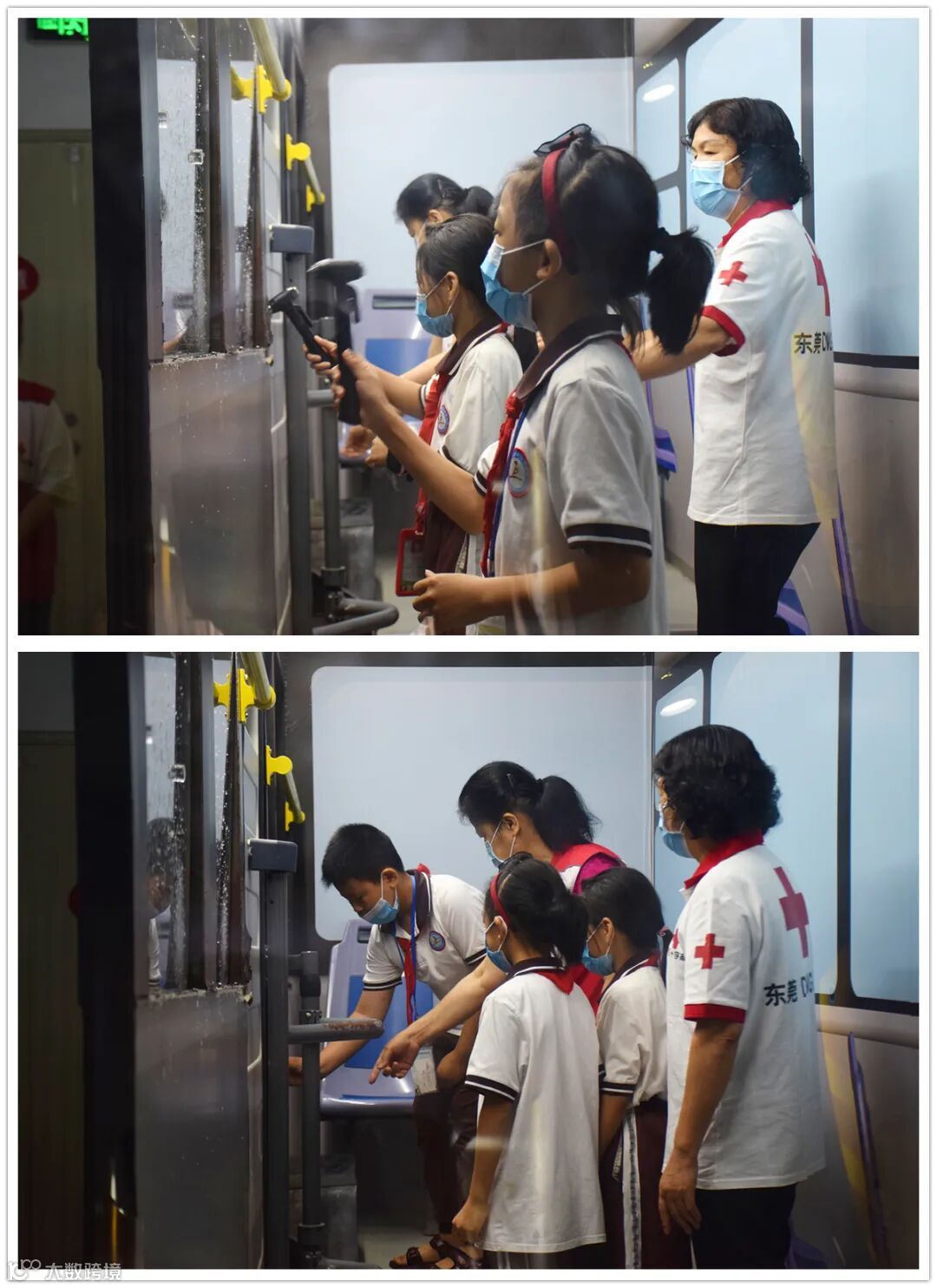 在“交通安全”体验区,学生们登上模拟公交车,按照讲解老师教的方法,用锤子砸玻璃,用气压阀降压开车门。