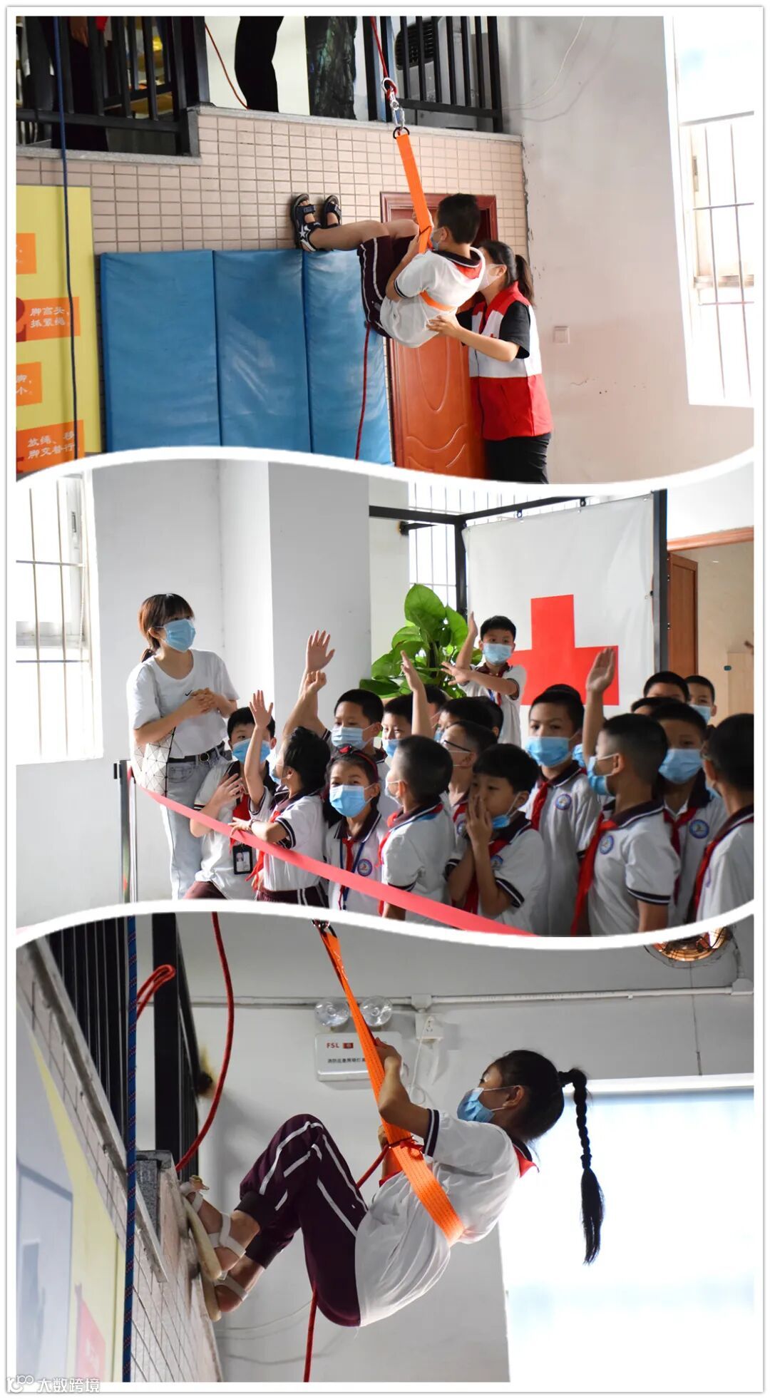 体验“高楼逃生”时,学生们克服畏高心理,勇于挑战自我,站在三米多高的“楼房”上,翻身仰视,放绳挪步,缓慢往下,旁边的小伙伴不时为其加油。
