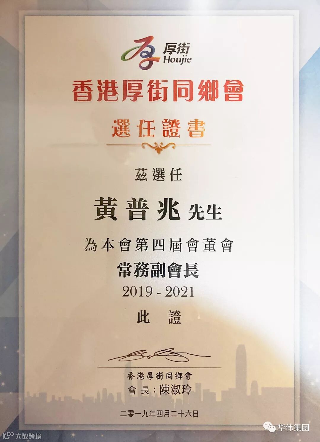 大会向荣誉顾问,名誉会长、常务副会长、副会长等骨干颁发选任证书。会上,我司黄普兆董事长被大会选任为香港厚街同乡会第四届会董会常务副会长。