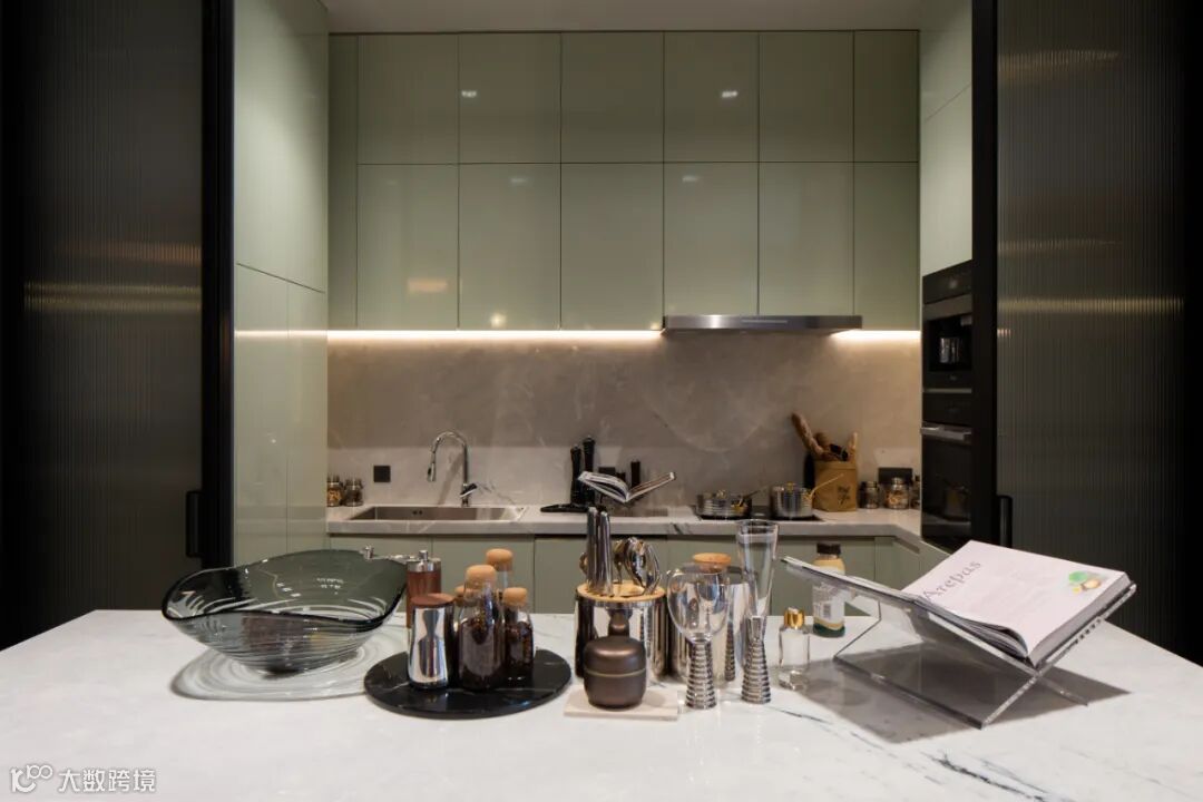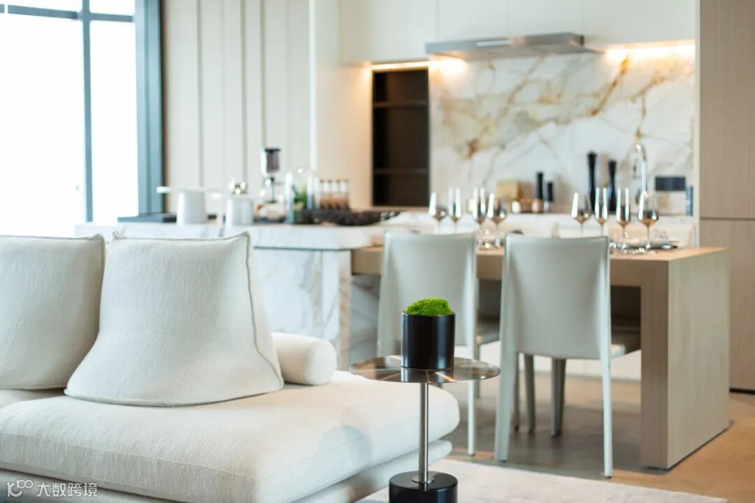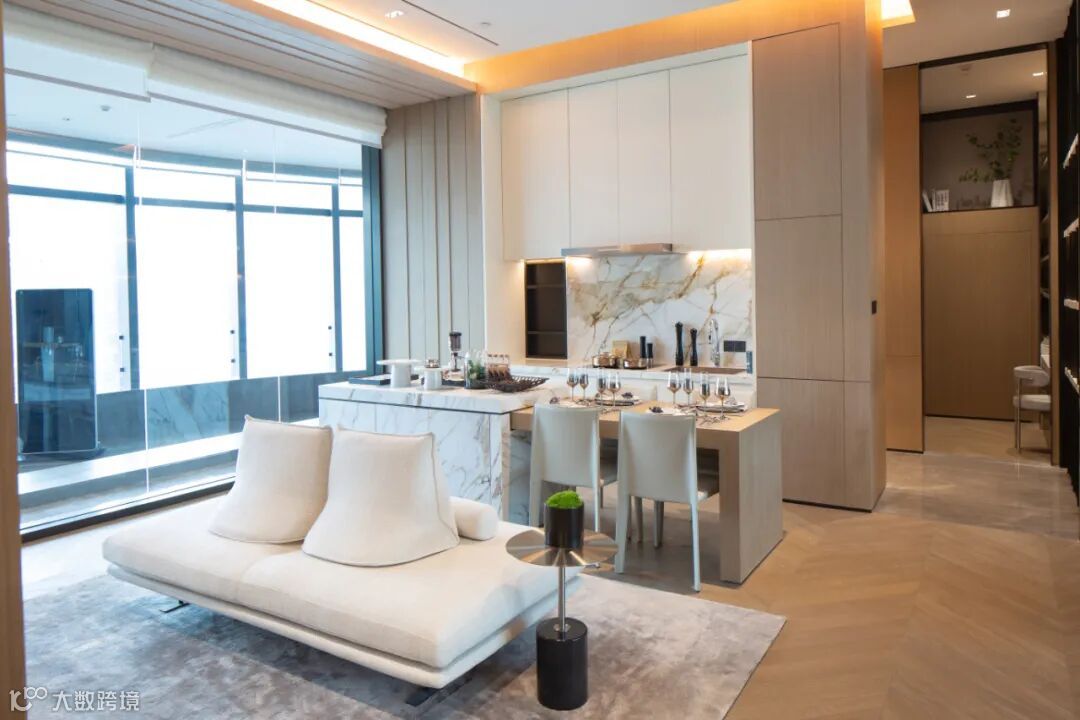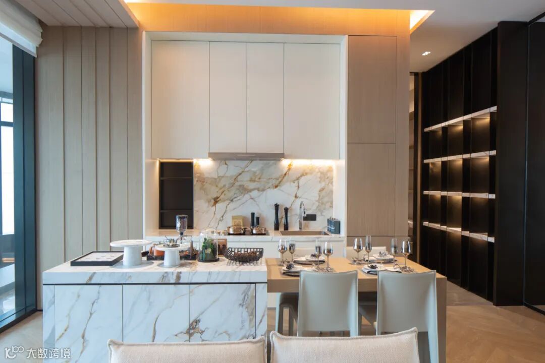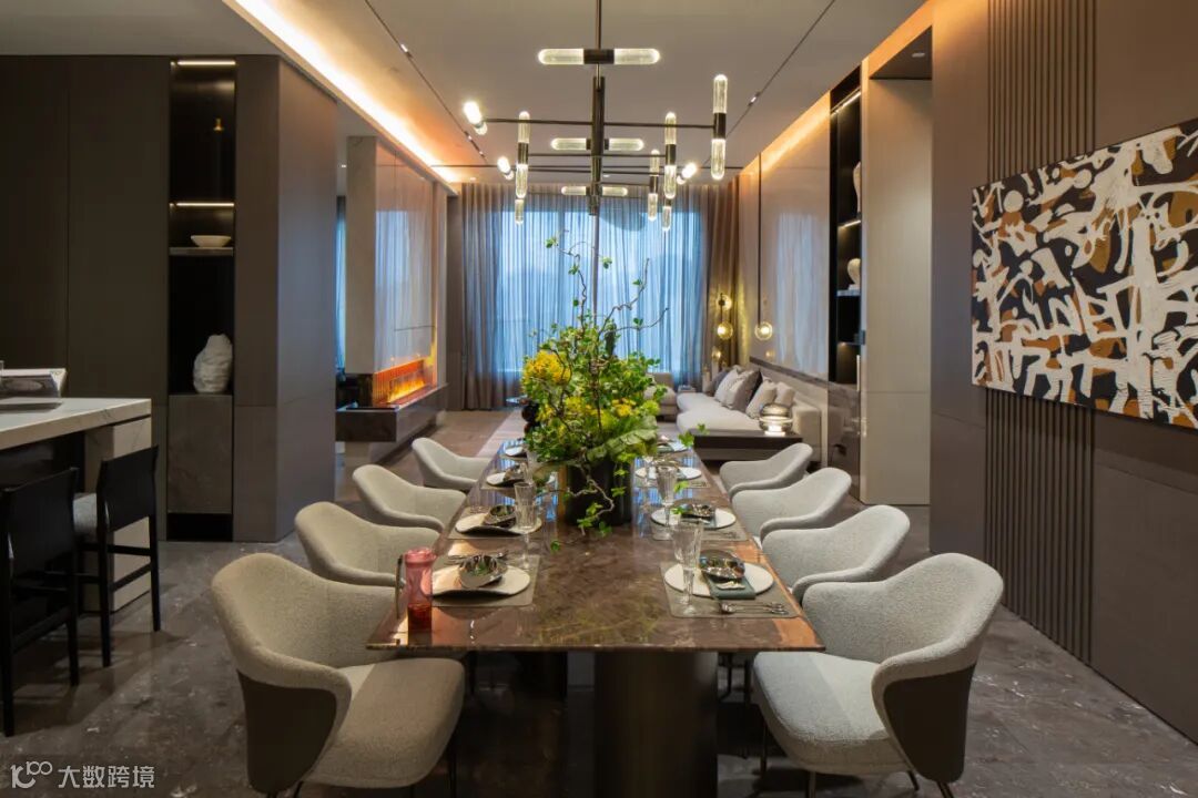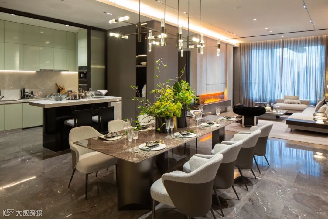 客餐厅为主流南北通透户型,区域布局合理,3.6米的奢适层高,增加了整个空间宽敞、通透感,客厅超大全景玻璃窗,外面繁华景观一览无余。室内墙面采用大面积深色、白、灰色调固装装饰,跟客厅灰色沙发、餐椅、灰色茶几、深色大理石餐桌等活动家具在色系上做到和谐、平衡,营造出奢华低调而有内涵的氛围,充满了舒适、雅奢、从容,简直是“完美无瑕”。