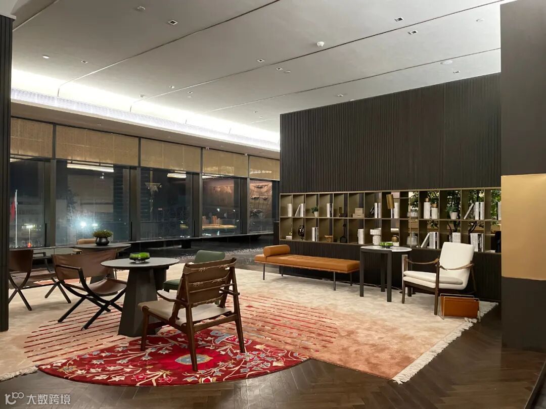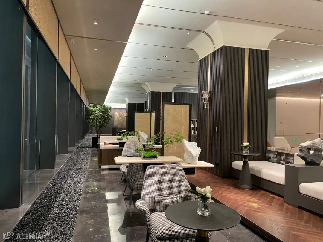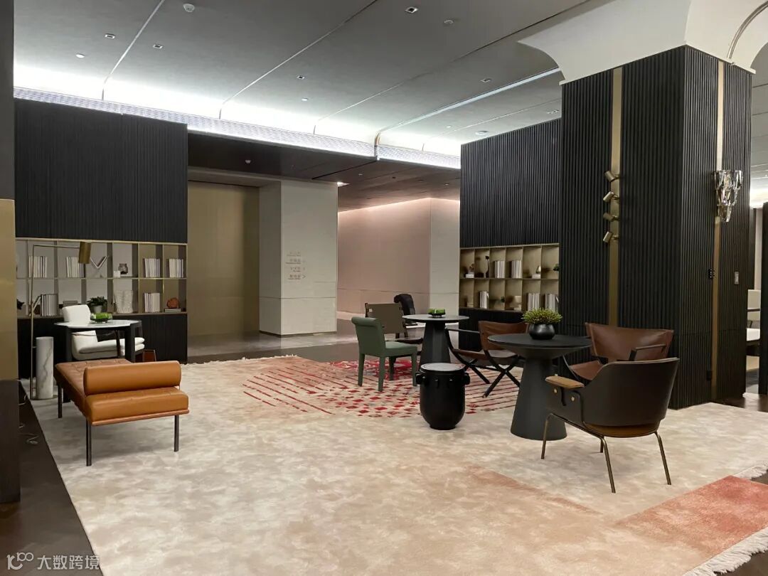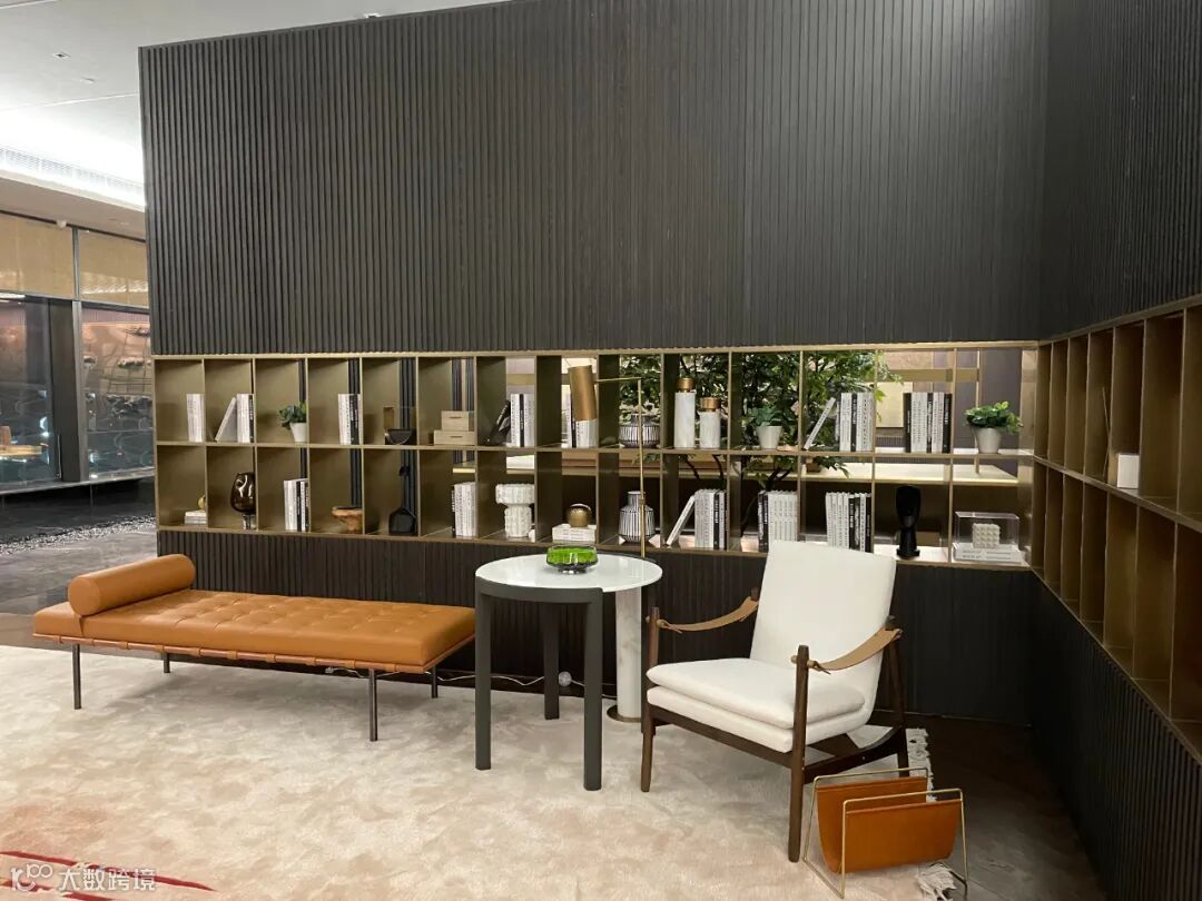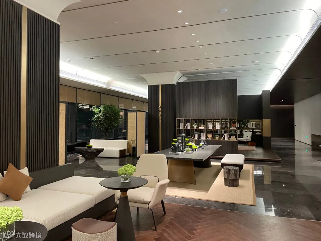 洽谈区域主要由黑、白、灰三种经典搭配色调构成,融入铜色金属装饰及藤编艺术,使整体空间呈现出优雅高级的氛围感。