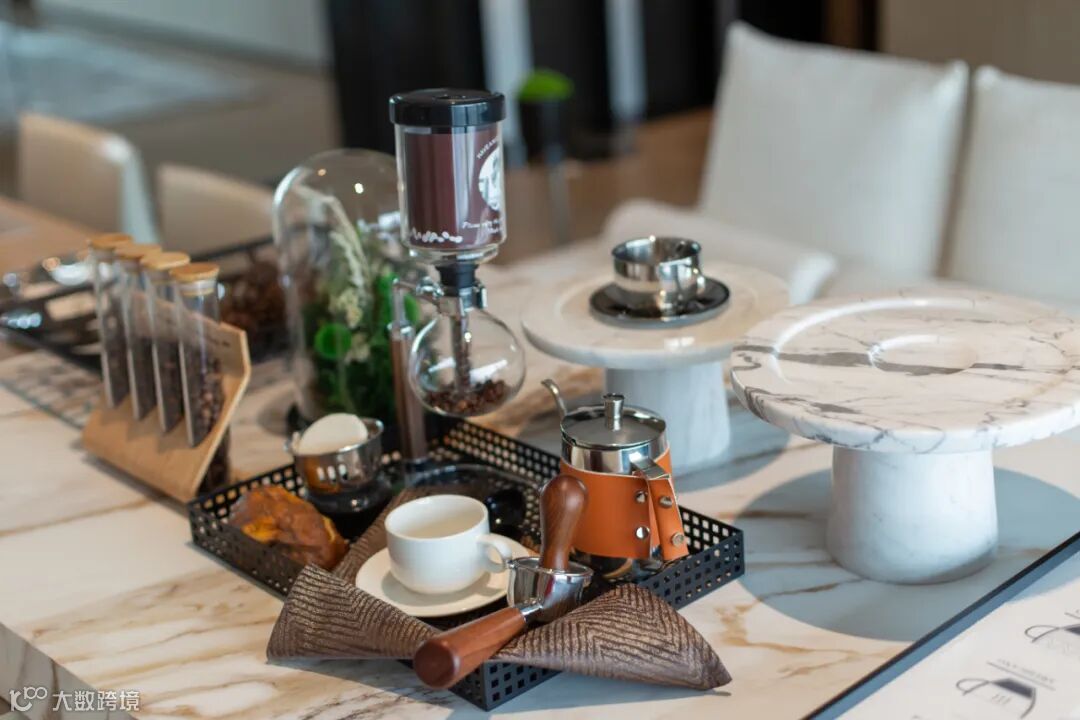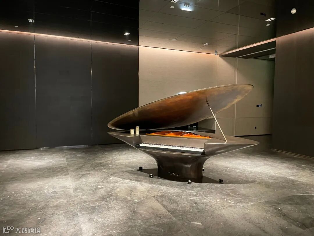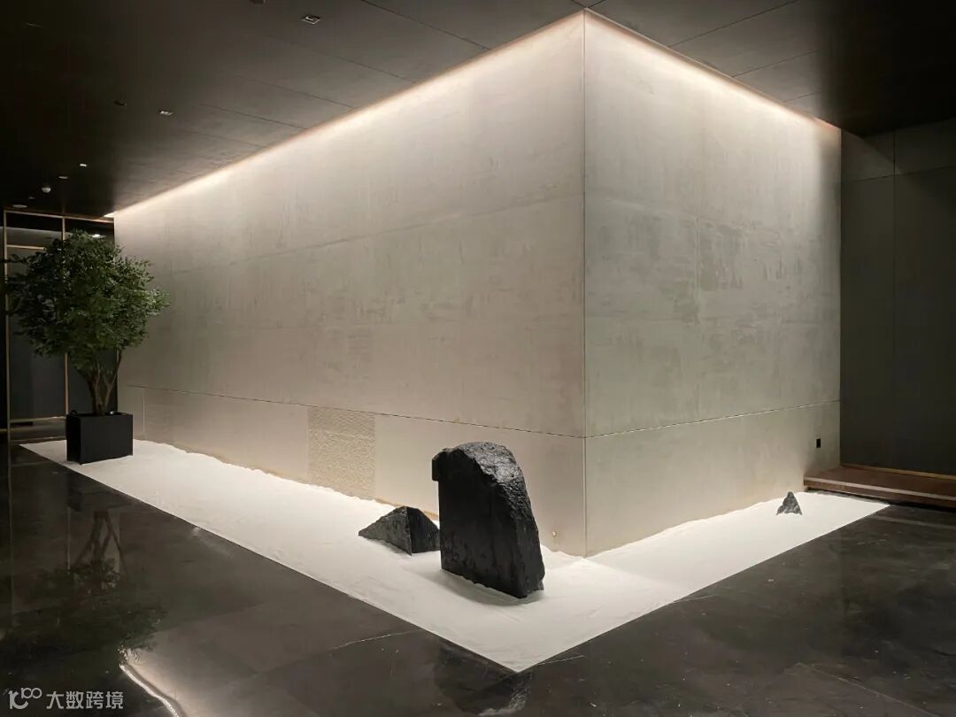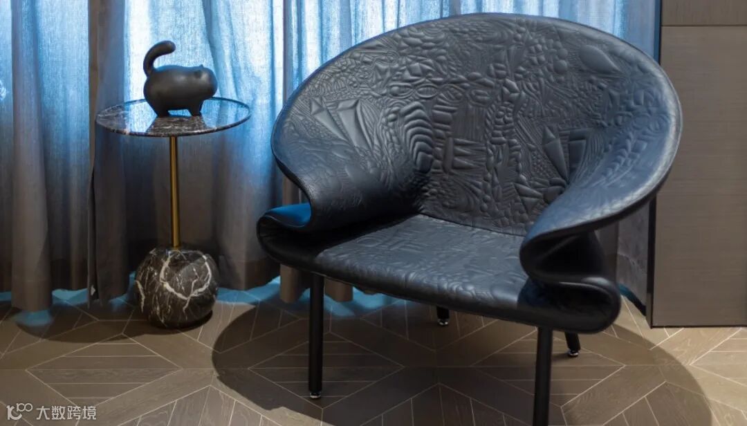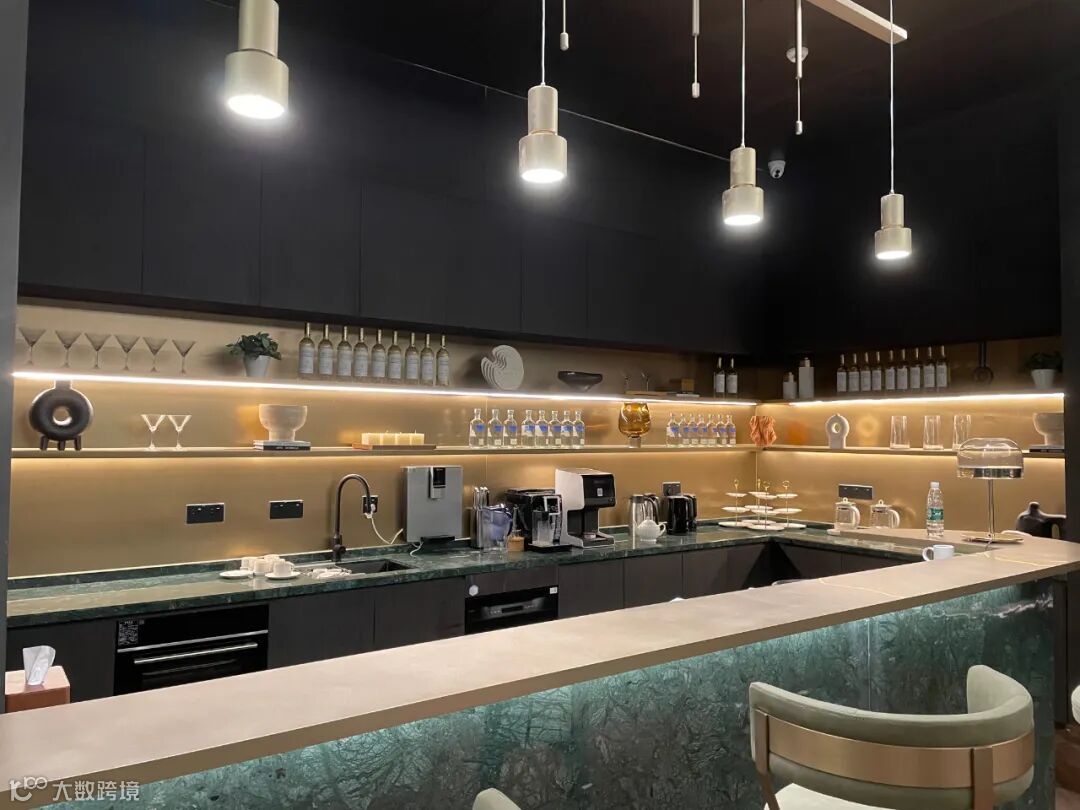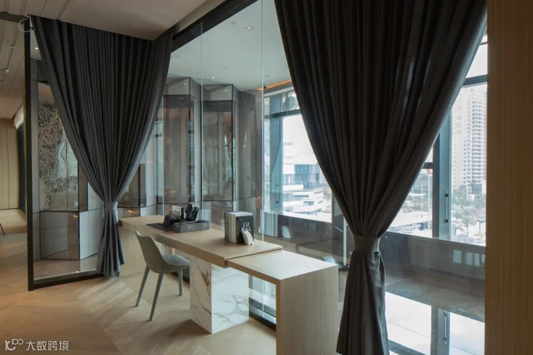 洽谈区域主要由黑、白、灰三种经典搭配色调构成,融入铜色金属装饰及藤编艺术,使整体空间呈现出优雅高级的氛围感。
