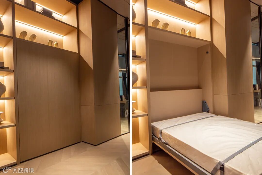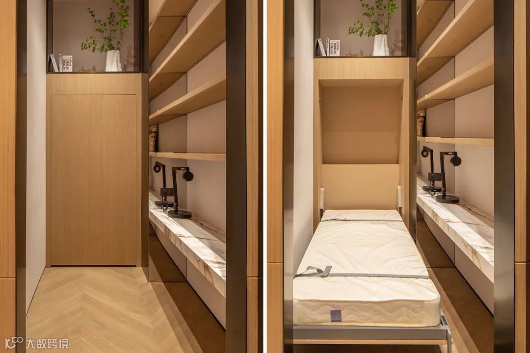 不得不说孩子房和客房采用的隐藏设计真的巧思妙想,白天可收纳隐藏于墙内,大大增加了空间利用率,夜晚即可放下平铺在地面,满足休憩功能,一举两得。