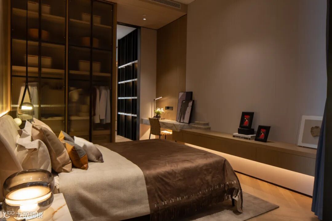 主卧室从床头柜、书桌到衣柜等均采用个性化定制设计,大大节省了空间和成本,从房间布局到软装饰品搭配,及柔和的暖色灯光设计,充满了精致时尚、温馨舒适的惬意感。