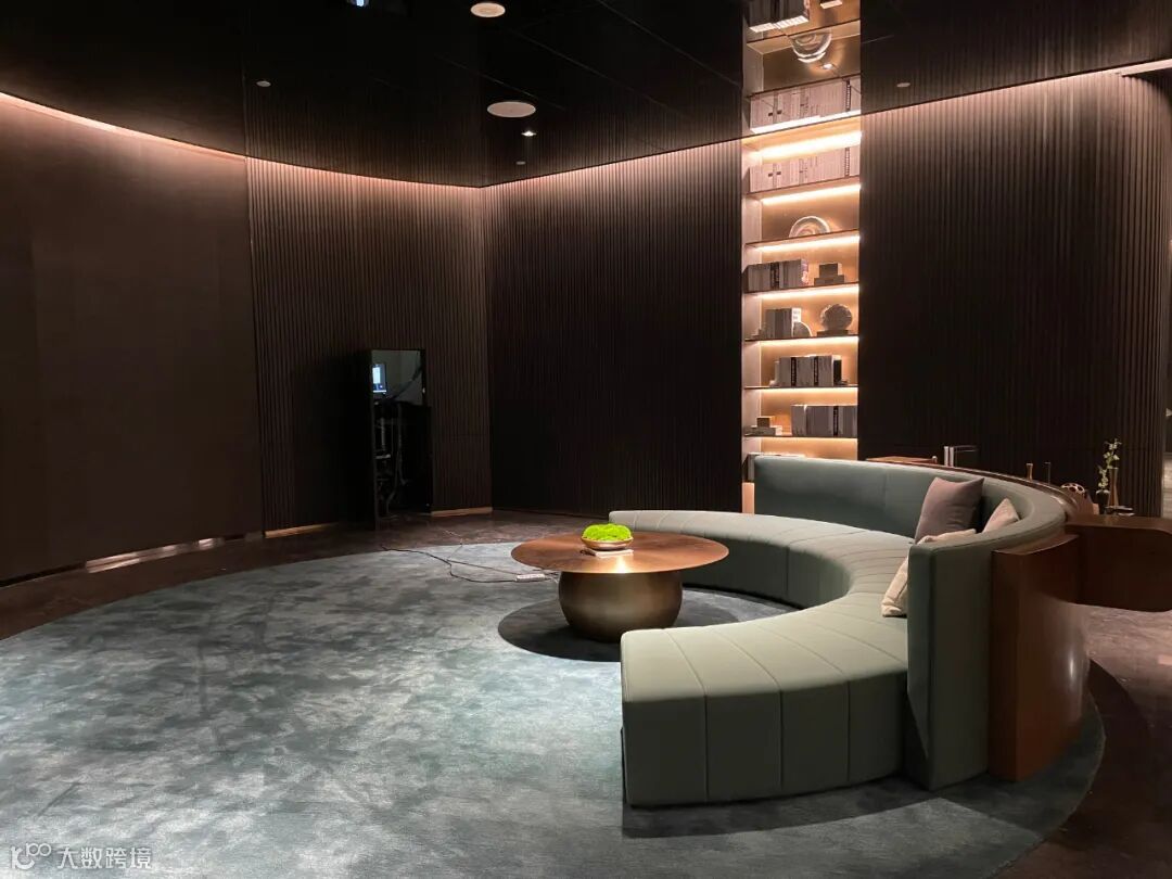 深棕色休闲椅、长条凳,坐感舒适,色调沉稳,与墙面深色木饰面,搭配古铜金属装饰,彰显出不凡的优雅格调品位。
