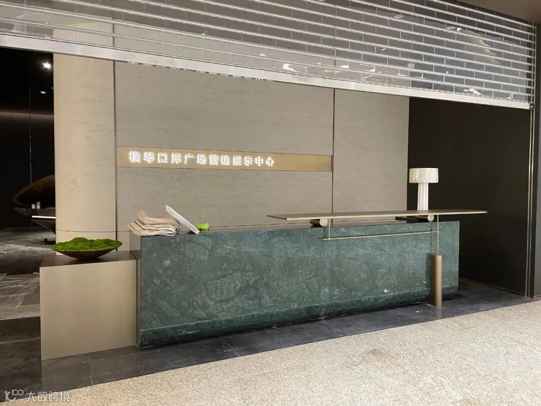 接待台采用绿色大理石材与铜色金属相结合的设计,清新、自然中兼具时尚及奢华质感。