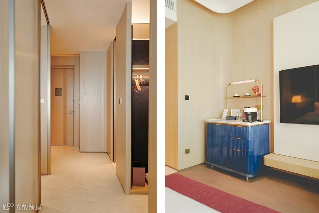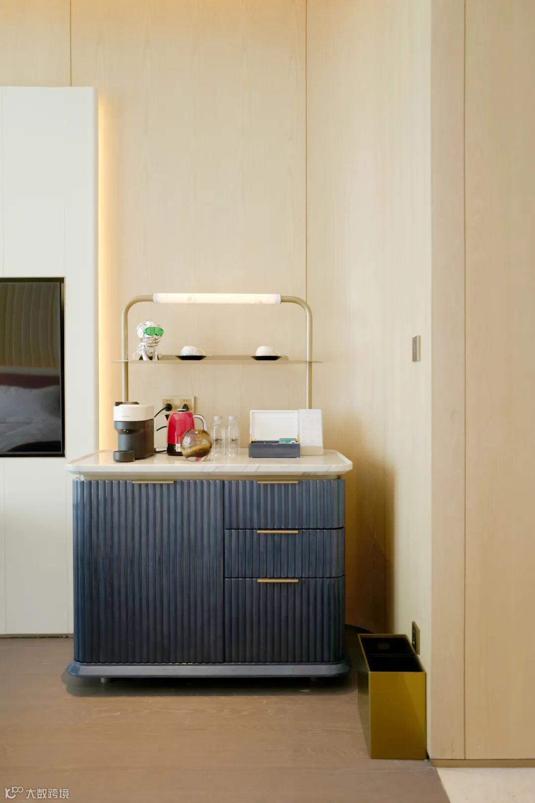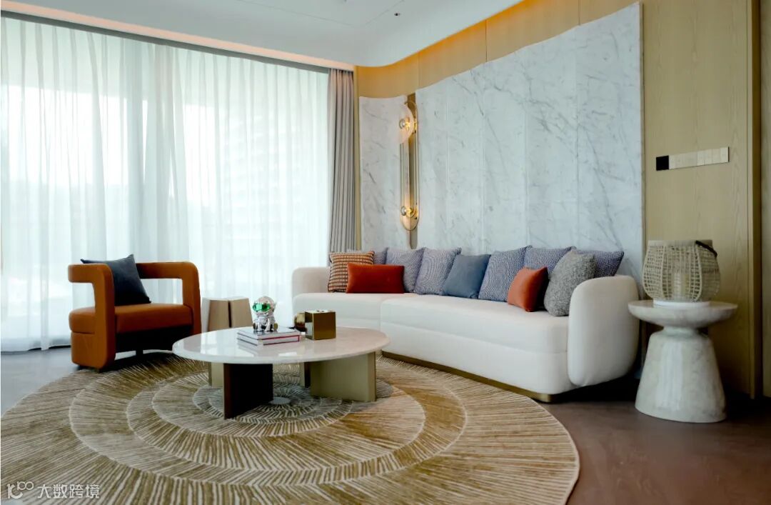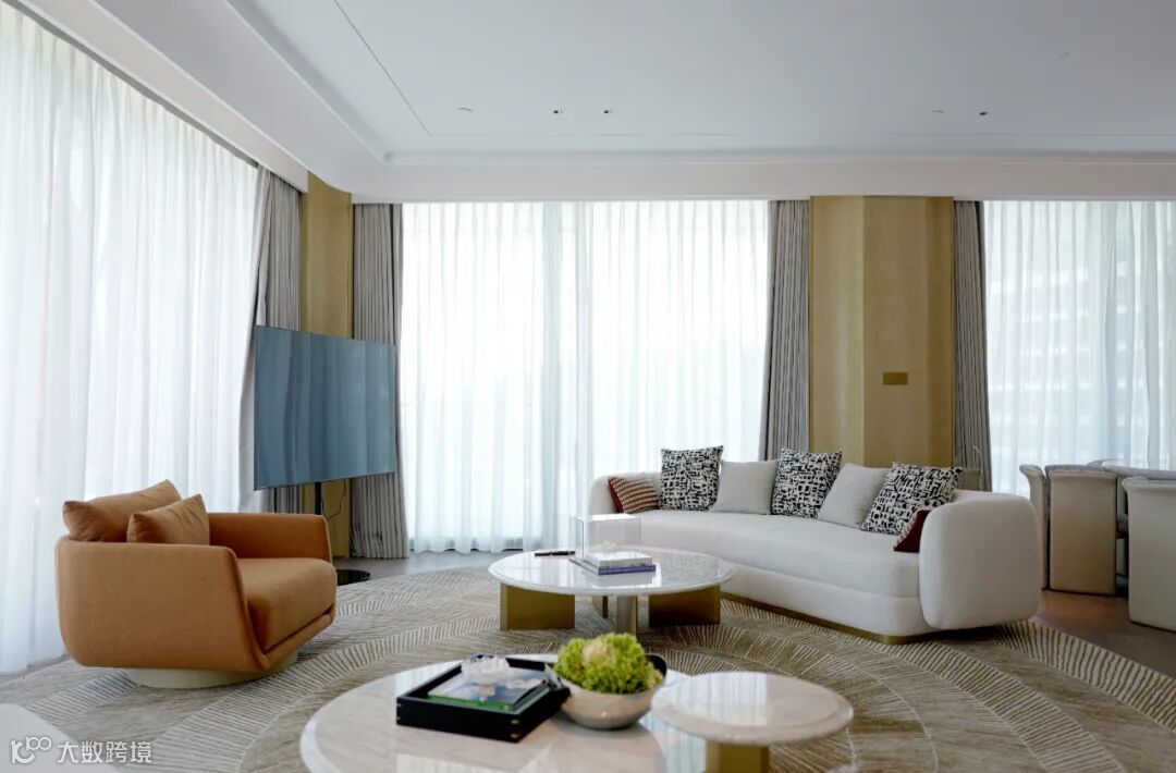 本案为现代极简奢华设计风格,以白色,原木色为主基调,以灰、蓝、红、咖啡棕等色调为辅,作为点缀装饰,以增加空间的层次感和活力,并融入了深圳特有的海洋文化元素;墙面装饰大量运用原木色波浪木纹、弧形转角造型;独特的悬浮式吊顶及采用无主灯设计,简约又时尚;简洁流畅的线条设计,纯粹的色彩搭配,大理石、金属等材质的运用以及细节的工艺处理,无不彰显极简风格的精髓,注重功能实用性的同时,追求形态与功能的完美结合,整体在视觉感受上体现了一种清新自然,舒适雅奢的氛围,与酒店的整体设计完美融合。